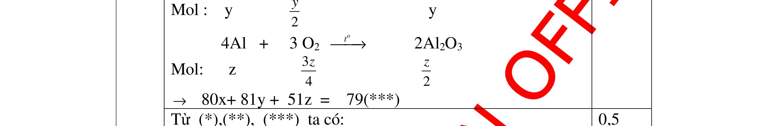 DẠYKÈMQUYNHƠNOFFICIAL 5 2SO2 +O2 xt,to 2SO3 0.25 6 SO3 + 2H2O → H2SO4 0.25 7 2H2SO4đặc +Cu to CuSO4 +SO2+2H2O 0.25 Câu21:(5điểm): Hoànthànhphươngtrìnhphảnứngsauvàchobiếttỉlệ sốnguyêntử,sốphântửcácchất? a. FeS2 + O2 ------>Fe2O3 + SO2 b. Al(OH)3 ------>H2O + Al2O3 c. FexOy + CO------> Fe + CO2 d. CxHy + O2 ------> H2O + CO2 e. Al + H2SO4 ------> Al2(SO4)3 + H2 f. P + O2 ------> P2O5 g.Na + H2O ------> NaOH + H2 h.Al + Cl2 ------>AlCl3 i. KClO3 ------>KCl + O2 k.KMnO4 ------>K2MnO4 +MnO2 +O2 Câu Hướngdẫnchấm Biểuđiểm 21 a. 4FeS2 + 11O2 0t → 2Fe2O3 + 8SO2 4 : 11 : 2 : 8 b. 2Al(OH)3 → 3H2O + Al2O3 2 : 3 : 1 c. FexOy + yCO 0t → xFe + yCO2 1 : y : x : y d. CxHy + (x+ 2 y )O2 0t → 2 y H2O + xCO2 1 : (x+ 2 y ) : 2 y : x e. 2Al + 3H2SO4 → Al2(SO4)3 + 3H2 2 : 3 : 1 : 3 f. 4P + 5O2 → 2P2O5 4 : 5 : 2 g.2Na + 2H2O → 2NaOH + H2 2 : 2 : 2 : 1 h.2Al + 3Cl2 → 2AlCl3 2 : 3 : 2 i. 2KClO3 0t → 2KCl + 3O2 2 : 2 : 3 k.2KMnO4 →K2MnO4+MnO2+O2 2 : 1 : 1 : 1 0,5 0,5 0,5 0,5 0,5 0,5 0,5 0,5 0,5 0,5
