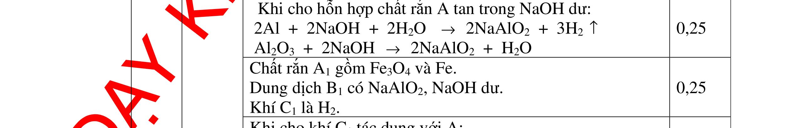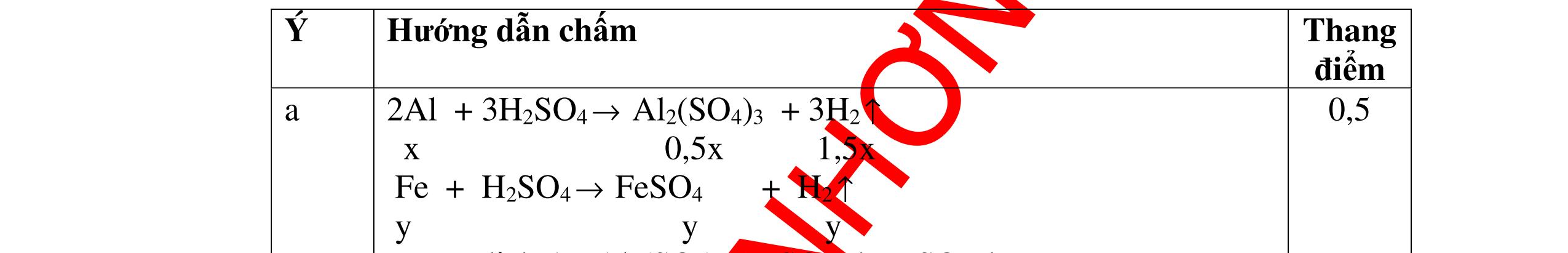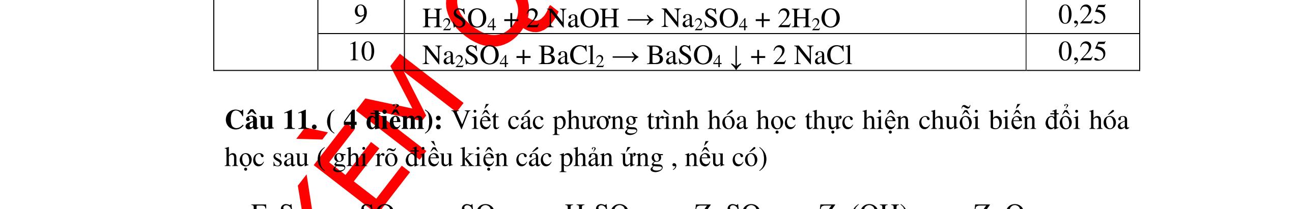 điều kiện cần thiết. Viết phương trình hóa học điều chế các chất theo sơ đồ chuyển hóa sau: Cu→CuO→Cu. Biết Fe có thể phản ứng với CuSO4 theo phương trình Fe + CuSO4 →FeSO4 + Cu b) SO2 + 2H2O + Br2 → H2SO4 + 2HBr 0,25 2 A, B, C, D lần lượt là: Cu(OH)2, CuO, Cu, H2SO4. Các phương trình hóa học: H2SO4 + Cu(OH)2 → CuSO4 + 2H2O H2SO4 + CuO → CuSO4 + H2O 2H2SO4 đặc,nóng + Cu → CuSO4 + 2H2O + SO2↑ CuSO4 + BaCl2 → BaSO4 + CuCl2 CuCl2 + 2AgNO3 → 2AgCl↓ + Cu(NO3)2 Cu(NO3)2 + 2NaOH → Cu(OH)2↓ + 2NaNO3 Cu(OH)2 → CuO + H2O CuO + CO → Cu + CO2 0,25 0,25 0,25 0,25 0,25 0,25 0,25 0,25 Câu2 Ý Hướngdẫnchấm Biểu điểm 1 1 4FeS2 + 11O2 > 2Fe2O3 + 8SO2 0,5 2 6KOH + Al2(SO4)3 > 3K2SO4 + 2Al(OH)3 0,5 3 FeO + 2HCl > FeCl2 + H2O 0,5 4 FexOy + yCO > xFeO + yCO2 0,5 5 2 Al + 6 H2SO4 Al2(SO4)3 + 3 SO2 + 6 H2O 0,5 6 3Fe3O4 + 8Al 0t → 9Fe + 4Al2O3 0,5 7 FexOy + yH2 0t → xFe + yH2O 0,5 8 2Fe + 3Cl2 0t → 2 FeCl3 0,25 2 1 2KMnO4 to K2MnO4 + MnO2+ O2 (điều chế O2) 0.25 2 Fe +2HCl →FeCl2 + H2 (điều chế H2) 0.25 3 Fe + CuSO4 →FeSO4 + Cu (điều chế Cu) 0.25 4 2Cu + O2 to 2CuO (điều chế CuO) 0.25 5 CuO + H2 to Cu+ H2O (điều chế Cu) 0.25 t0 t0