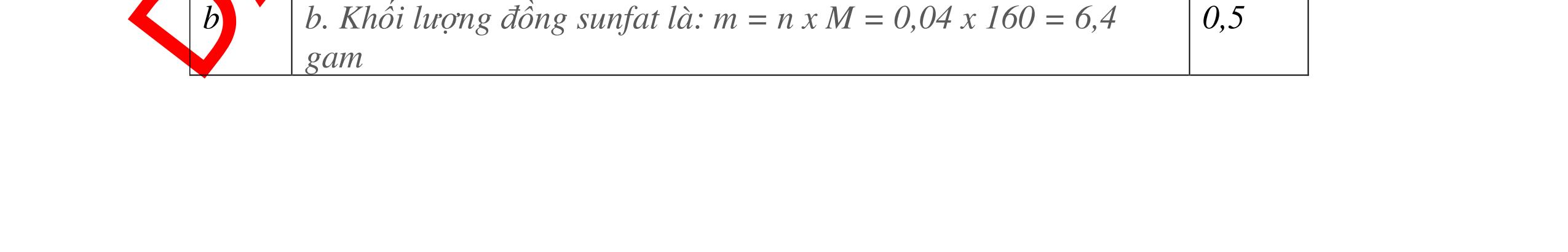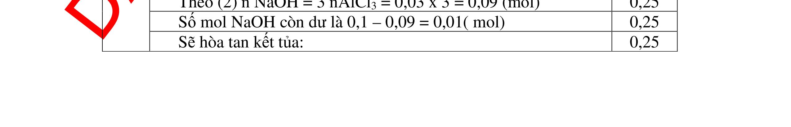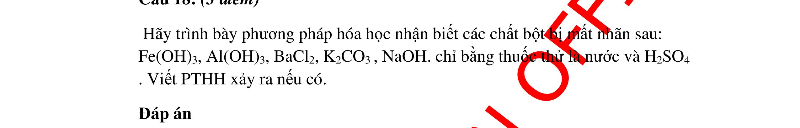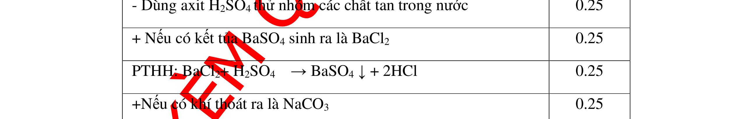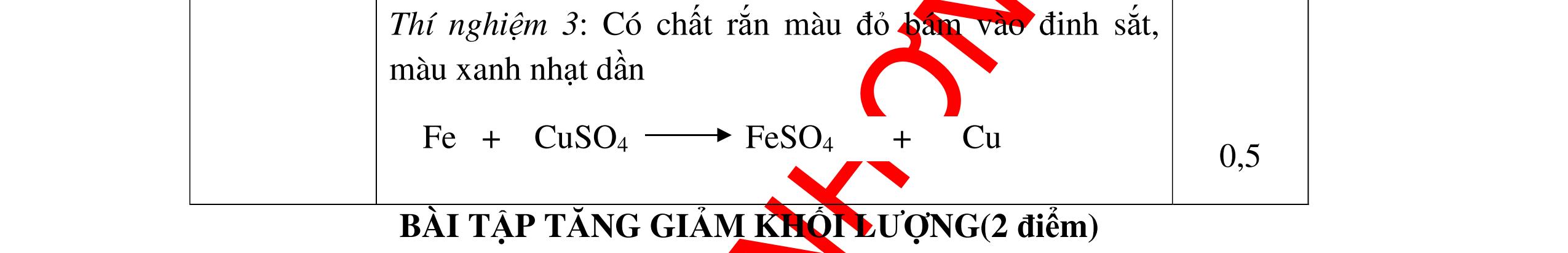 ch BaCl2. b) Cho một lá nhôm vào dung dịch HCl, sau đó dẫn khí thoát ra vào ống nghiệm đựng bột CuO nung nóng. 5. 2 điểm a) Xuất hiện kết tủa màu trắng Na2SO4 + BaCl2 → BaSO4 + 2NaCl b) Có khí không màu thoát ra, Al tan dần. Bột CuO màu đen chuyển dần thành màu đỏ (Cu), xuất hiện những giọt nước trên thành ống nghiệm. 2Al + 6HCl → 2AlCl3 + 3H2 H2 + CuO(đen) ot → Cu(đỏ)+ H2O 0,5 0,5 0,5 0,25 0,25 Câu 6: Nêu hiện tượng xảy ra của các thí nghiệm : a) Hòa tan một mẩu nhỏ vôi sống CaO vào nước b) Đốt cháy dây sắt có quấn quanh mẩu than trong lọ đựng khí oxi c) Đốt cháy photpho đỏ trong lọ đựng khí oxi sau đó hòa tan vào nước 6. 2 điểm a) CaO tan dần, phản ứng tỏa nhiều nhiệt CaO + H2O → Ca(OH)2 b) Sắt cháy sáng trong oxi, có chất rắn màu nâu đen rơi xuống đáy. 3Fe + 2O2 ot → Fe3O4 c) Photpho cháy sáng trong oxi với ngọn lửa chói, có khói trắng bám trong bình. 4P + 5O2 ot → 2P2O5 0,25 0,25 0,25 0,5 0,25 0,5