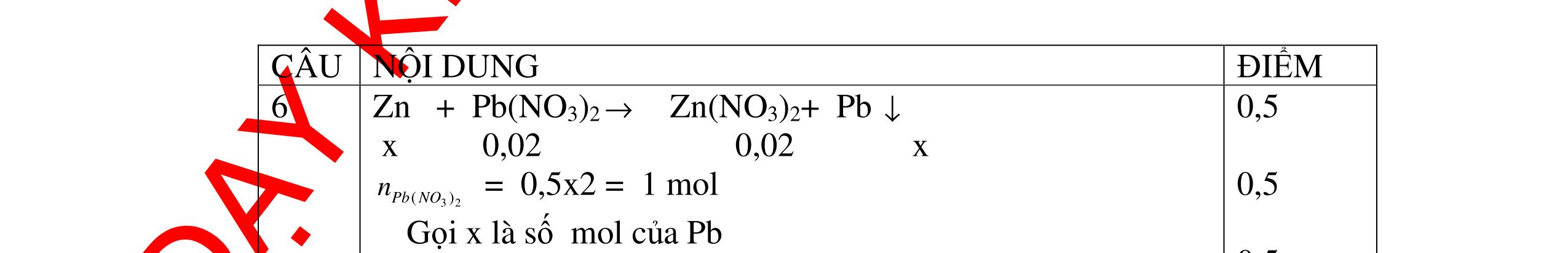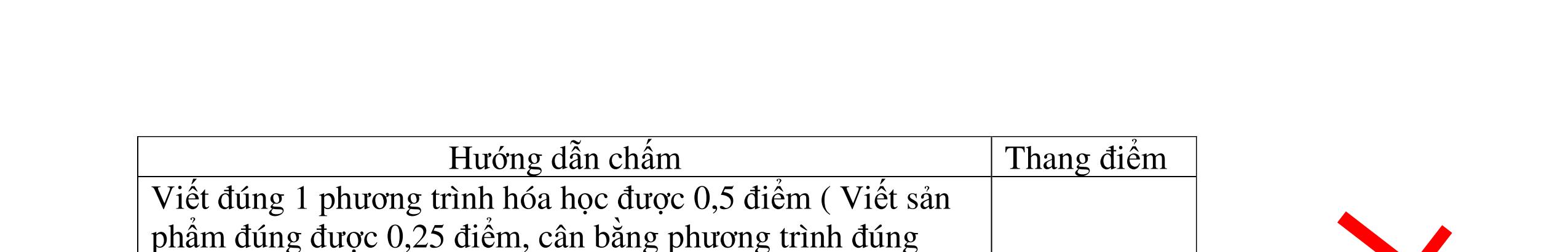 DẠYKÈMQUYNHƠNOFFICIAL Câu Hướng dẫn chấm Điểm 26 a. 4FeS2 + 11O2 0t → 8SO2 + 2Fe2O3 b. 2AgNO3 + CuCl2 → 2AgCl + Cu(NO3)2 c. 2Na + 2H2O → 2NaOH + H2 d. 2Fe3O4 + 8H2 0t → 6Fe + 8H2O e. 2Fe + 3Cl2 0t → 2FeCl3 f. 3Ca + 2H3PO4 → Ca3(PO4)2 + 3H2 g.CaCO3 + HCl → CaCl2 +H2O+CO2↑ h.Mg + HNO3 → Mg(NO3)2 +NO +H2O i.2KMnO4 0t → K2MnO4 +O2 +MnO2 k.2NaOH + CuCl2 → Cu(OH)2 +2NaCl 0,5 0,5 0,5 0,5 0,5 0,5 0,5 0,5 0,5 0,5 Câu27.(5điểm): 1. Phảnứngcủacâyxanhquanghợptạoratinhbộtvàkhíoxiđượcthểhiện bằngsơđồ: CO2 + H2O → ChÊt diÖp lôc ¸nh s¸ng (C6H10O5)n + O2 (khícacbonic) (nước) (tinhbột) (khíoxi) a)Hãylậpphươngtrìnhhoáhọcchosơđồphảnứngtrên. b)Chobiếttỉlệgiữasốphântửkhícacbonic(CO2)vàsốphântửnước. 2. Lậpphươngtrình hoáhọccủaphảnứngtheosơđồsau: a) CaCO3 + HCl → CaCl2 +H2O+CO2↑ b)Mg + HNO3 → Mg(NO3)2 +NO +H2O c)KMnO4 ot → K2MnO4 +O2 +MnO2 Câu Hướng dẫn chấm Điểm 27 1. 6nCO2 + 5nH2O ChÊtdiÖplôc/¸nhs¸ng → (C6H10O5)n +6nO2 Tinh bột -TỉlệsốphântửkhíCO2 vàphântửhơinướclà: 22 COHO n:n6:5 = . 1,0 1,0 2.LậpPTHHđúngcủamỗitrườnghợpcho a) CaCO3 + 2HCl → CaCl2 +H2O+CO2↑ b) 3Mg + 8HNO3 → 3Mg(NO3)2 +2NO +4H2O c) 2KMnO4 ot → K2MnO4 +O2 +MnO2 d) 2NaOH + CuCl2 → Cu(OH)2 +2NaCl 0,75 0,75 0,75 0,75