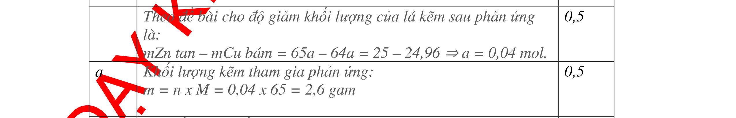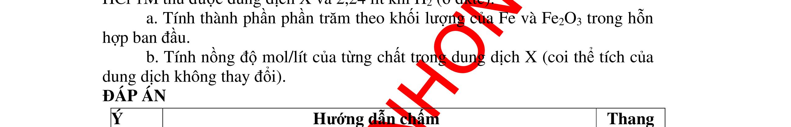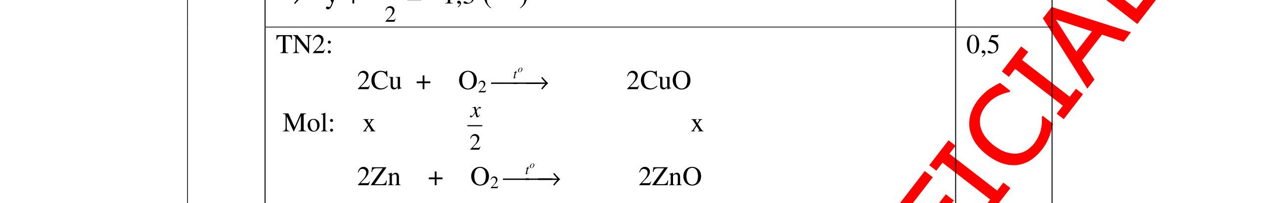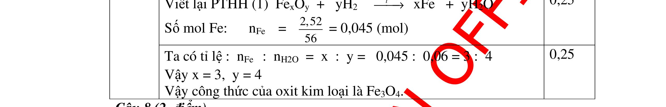 DẠYKÈMQUYNHƠNOFFICIAL Giải phương trình ta được: MR = 24 kim loại hoá trị II là Mg Công thức hóa học của oxit MgO 0,5 Câu 14: Một loại oxit sắt có thành phần là 7 phần khối lượng sắt kết hợp với 3 phần khối lượng oxi. Hãy xác định công thức hóa học của oxit sắt, biết công thức hóa học trùng công thức đơn giản nhất. Bài làm: 14. 2,5 điểm Đặt công thức tổng quát của oxit sắt là FexOy. Xét 1 mol FexOy nFe = x (mol) nO = y (mol) 567 163 Fe O m x my == 2 3 x y = Vậy công thức hóa học của oxit sắt là Fe2O3. 0,5 0,25 0,5 0,75 0,5 Câu 15:( 2,5 điểm). Hòa tan hoàn toàn 16,25 gam kim loại M ( chưa rõ hóa trị) vào dung dịch axit clohidric. Sau phản ứng kết thúc thu được 5,6 lit khí hidro (đktc). Xác định kim loại M ? 15 1 Gọi n là hóa trị của M. 0.25 PTHH: 2M + 2nHCl → 2MCln + nH2↑ 2 mol n mol x mol nx /2 mol 1 Ta có hệ phương trình: Mx = 16,25 (1) nx / 2 = 5,6 / 22,4 = 0,25 (2) Từ (2) nx = 0,25 x2 = 0,5 (3) Từ (1) và (3) Mx / nx = 16,25 / 0,5 M / n = 32,5 0,5