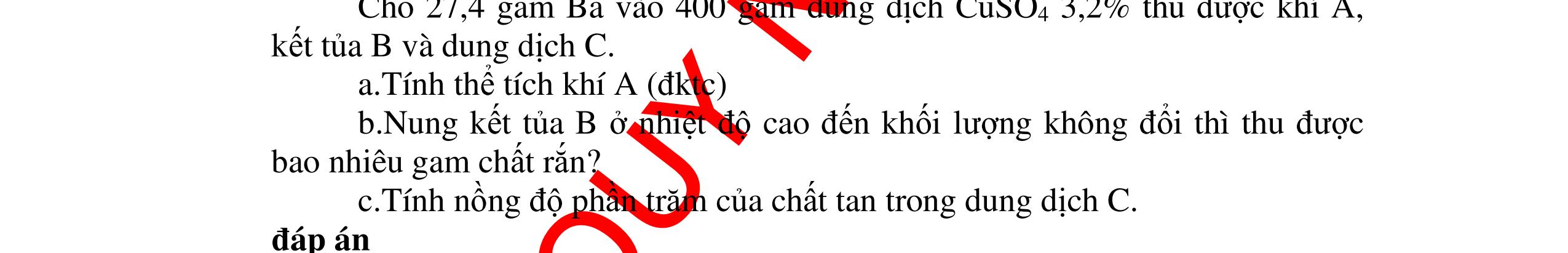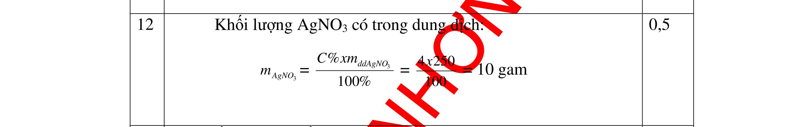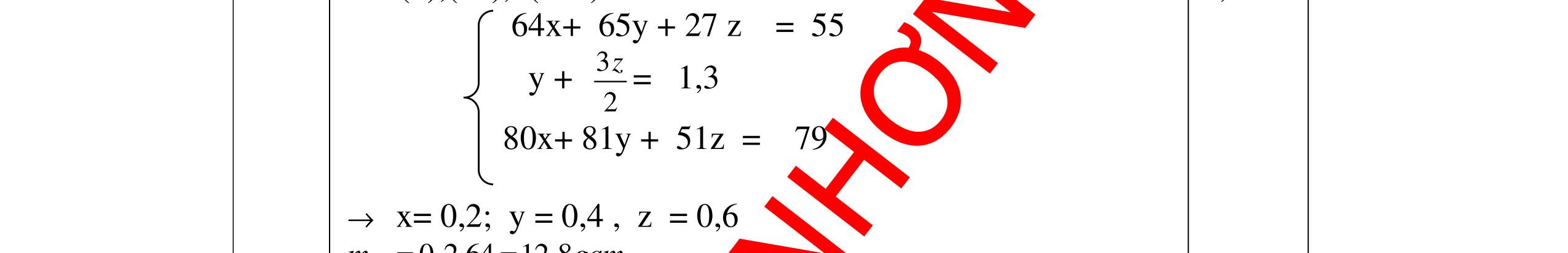 DẠYKÈMQUYNHƠNOFFICIAL 2,5 điểm PTHH: 2M + Cl2 →2MCl 2M(g) (2M + 71)g 9,2g 23,4g Ta có: 23,4 . 2M = 9,2(2M + 71) suy ra: M = 23. Kim loại có khối lượng nguyên tử bằng 23 là Na. Vậy muối thu được là: NaCl 0,75 0,75 0,25 0,5 Câu 12: Hoà tan 3,06g oxit MxOy bằng dung dich HNO3 dư sau đó cô cạn thì thu được 5,22g muối khan. Hãy xác định kim loại M biết nó chỉ có một hoá trị duy nhất. Bài làm: 12. 2,5 điểm PTHH: MxOy + 2yHNO3 → xM(NO3)2y/x + yH2O Từ PTPƯ ta có tỉ lệ: 3,065,22 16124 xx MyMy = ++ M = 68,5.2y/x Trong đó: Đặt 2y/x = n là hoá trị của kim loại. Vậy M = 68,5.n (*) Cho n các giá trị 1, 2, 3, 4. Từ (*) M = 137 và n =2 là phù hợp. Do đó M là Ba, hoá trị II. 0,5 0,5 0,5 0,25 0,25 0,5 Câu 13: Khi hoà tan một lượng của một oxit kim loại hoá trị II vào một lượng vừa đủ dung dịch axit H2SO4 4,9%, người ta thu được một dung dịch muối có nồng độ 5,78%. Xác định công thức của oxit trên. Bài làm: 13. 2,5 điểm Đặt công thức của oxit là RO PTHH: RO + H2SO4 → RSO4 + H2O (MR + 16) 98g (MR + 96)g Giả sử hoà tan 1 mol (hay MR + 16)g RO Khối lượng dd RSO4 (5,87%) = (MR + 16) + (98 : 4,9).100 = MR + 2016 C% = 96 2016 R R M M + + .100% = 5,87% 0,25 0,5 0,25 0,5 0,5