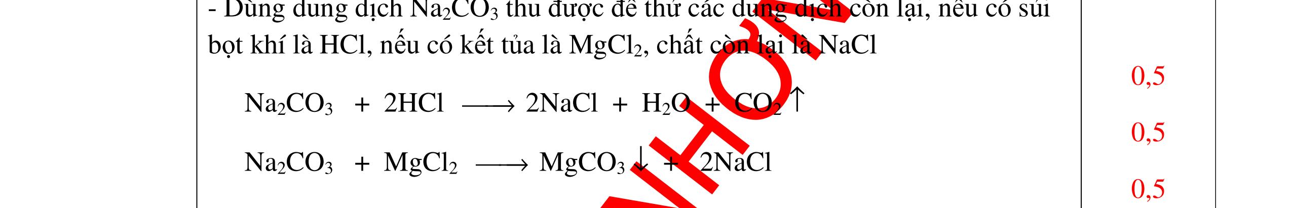 DẠYKÈMQUYNHƠNOFFICIAL + PTHH: 2Na + 2H2O → 2NaOH + H2 2H2 + O2 ot → 2H2O 0,25 0,25 b) Xuất hiện kết tủa trắng. Na2CO3 + Ca(OH)2 → CaCO3 + 2NaOH 0,5 0,5 Câu 4: Nêu hiện tượng và viết phương trình hóa học xảy ra khi: a) Cho một mẩu natri nhỏ vào cốc đựng nước có bỏ sẵn một mẩu giấy quỳ tím. b) Cho một lá nhôm vào ống nghiệm đựng dung dịch axit clohidric. 4. 2 điểm a) Natri nóng chảy thành giọt tròn chuyển động nhanh trên mặt nước, mẩu Natri tan dần, có khí không màu thoát ra, quỳ tím chuyển dần sang màu xanh. 2Na + 2H2O → 2NaOH + H2 b) Nhôm tan dần a) Nhỏ dung dịch Na2SO4 vào dung dị