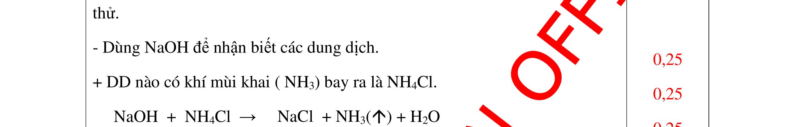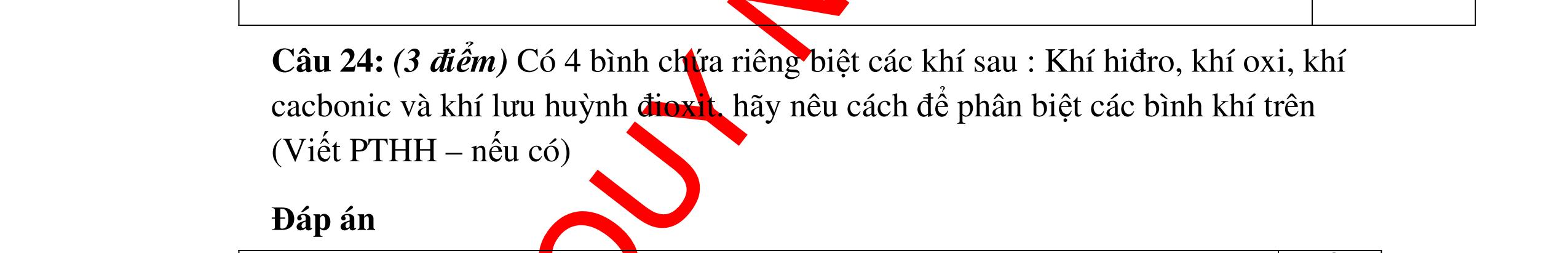 DẠYKÈMQUYNHƠNOFFICIAL CHUYÊN ĐỀ NHẬNBIẾTCÁCCHẤT(3 điểm) Ngườithựchiện: 1)LòThị Bích-TrườngPTDTBTTHCSNậmHàng(Từ câu1–20) Câu1(3.0 điểm): Bằng cách nào có thể nhận biết các khí sau đựng riêng biệt bị mất nhãn: không khí, khí hiđrô, khí oxi, khí cacbonic? Giải thích và viết phương trình hóa học (nếu có)? Câu2(3.0 điểm):Trình bày phương pháp nhận biết các dung dịch đựng trong 4 lọ mất nhãn sau: Nước, Natri hiđôxit, Axit clohiđric, Natriclorua? Viết phương trình phản ứng xảy ra (nếu có)? Câu3(3.0 điểm): Có 4 khí: O2 , H2 , CO2 và N2 đựng trong 4 lọ riêng biệt. Hãy trình bày phương pháp hóa học nhận biết mỗi lọ khí và Viết phương trình phản ứng xảy ra (nếu có)? CâuÝ Hướngdẫnchấm Thang điểm 1 - Lấy mỗi chất một ít cho mỗi lần thử - Cho các khí trên qua dung dịch nước vôi trong Ca(OH)2 dư, khí nào làm đục nước vôi trong đó là khí CO2.