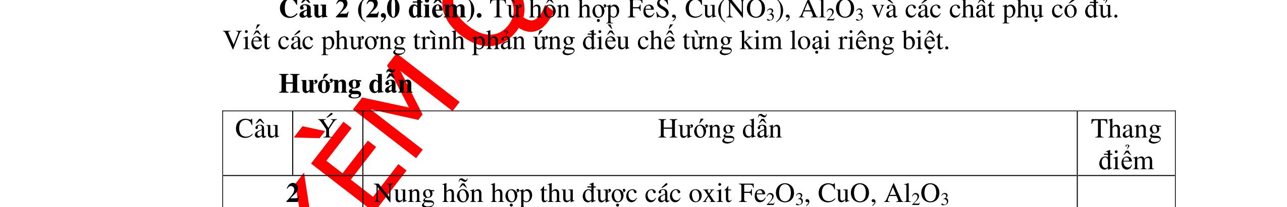 DẠYKÈMQUYNHƠNOFFICIAL H2 + Cl2 -> 2HCl 4FeS2 + 11O2 t0 8SO2↑ + 2Fe2O3 Fe2O3 + 6HCl -> 2FeCl3 + 3H2O 0,25 0,5 0,25 FeCl3 + 3NaOH -> Fe(OH)3 + 3NaCl 0,25 SO2 + 2NaOH -> Na2SO3 + H2O 0,25 Câu7. Từ hỗn hợp FeS, Cu(NO3)2, Al2O3 và các chất phụ có đủ. Viết các phương trình phản ứng điều chế từng kim loại riêng biệt. Câu Hướng dẫn chấm Điểm 7 Nung hỗn hợp thu được các oxit Fe2O3, CuO, Al2O3 4FeS + 7O2 → 2Fe2O3 + 4SO2 2Cu(NO3)2 → 2CuO + 4NO2 + O2 0.5 Cho NaOH dư vào hỗn hợp oxit trên thì: Al2O3 tan, còn Fe2O3, CuO không tan tách ra hai phần. Lấy nước lọc điều chế nhôm. Al2O3 + 2NaOH → 2NaAlO2 + H2O NaAlO2 + CO2 + 2H2O → Al(OH)3 + NaHCO3 2Al(OH)3 0t → Al2O3 + 3H2O 2Al2O3 → 4Al + 3O2 0.5 - Cho dòng khí CO qua hỗn hợp Fe2O3, CuO thu được hỗn hợp 2 kim loại CuO + CO → Cu + CO2 Fe2O3 + CO → Fe + CO2 0.25 - Cho hỗn hợp Cu, Fe vào dung dịch HCl thì chỉ có Fe tan được, tách ra Cu Fe + HCl → FeCl2 + H2 0.25 Từ FeCl2 điều chế ra Fe: FeCl2 + 2NaOH → Fe(OH)2 + 2NaCl Fe(OH)2 0t → FeO + H2O FeO 0t → Fe + CO2 0.5 Câu8. Từ pirit sắt, nước biển, không khí và các thiết bị cần thiết khác. Hãy viết các phương trình hóa học điều chế các chất: nước Javen, FeSO4, FeCl3. Câu Hướng dẫn chấm Điểm 8 Điện phân dung dịch NaCl Có màng ngăn: 2NaCl + 2H2O ®iÖn ph©n dung dÞch cã mµng ng¨n → 2NaOH + Cl2 ↑ + H2 ↑ 0,25