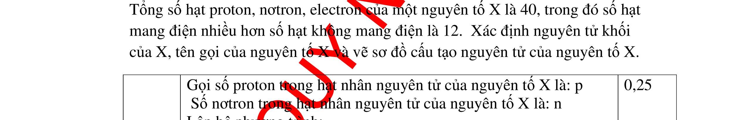 DẠYKÈMQUYNHƠNOFFICIAL Câu6. Nguyên tử X có tổng các hạt là 52 trong đó số hạt mang điện nhiều hơn số hạt không mang điện là 16 hạt. Hãy xác định số hạt p, n e trong nguyên tử X. Câu Hướngdẫnchấm Điểm 6 Ta có p + n + e = 52 P + e – n = 16 0.25 Vì p = e nên : 2p + n = 52 2p – n = 16 0.25 Suy ra 4p = 68 Suy ra p = e = 17 , n = 18 0.5 Câu7. Nguyên tử của một nguyên tố có tổng số các loại hạt là 34, trong đó số hạt mang điện nhiều hơn số hạt không mang điện là 10. Tính thành phần phần trăm về số lượng của các hạt trong nguyên tử nguyên tố đó. Câu Hướngdẫnchấm Điểm 7 Tổng số hạt bằng 34 ta có: n + p+ e = 34 (1) 0.25 Số hạt mang điện nhiều hơn hạt không mang điện là 10, ta có: p+e – n = 10 ( 2) Mà số p = số e ( 3) 0.25 ta có: p = e = 11, n = 12 0.5 Câu8. Một nguyên tử nguyên tố X có tổng số lượng các hạt là 34, trong đó số hạt không mang điện chiếm 35,3%. Một nguyên tử nguyên tố Y có tổng số lượng các hạt là 52, trong đó số hạt mang điện nhiều hơn số hạt không mang điện là 16 hạt. Xác định số lượng mỗi loại hạt trong nguyên tử X, Y? KHHH nguyên tử X, Y? Câu Hướngdẫnchấm Điểm + Nguyên tử nguyên tố X: Số hạt Nơtron là: 34. 100 35 = 12 (hạt) Số hạt Proton bằng số hạt Electron và bằng: 11 2 3412 = (hạt) Vậy KHHH nguyên tử nguyên tố X là: Na. 0,5 + Nguyên tử nguyên tố Y: Gọi số hạt Proton là Z, số hạt Nơtron là N số hạt Electron là Z. Tổng số lượng các hạt là: 2Z + N = 52 (1) 0,5