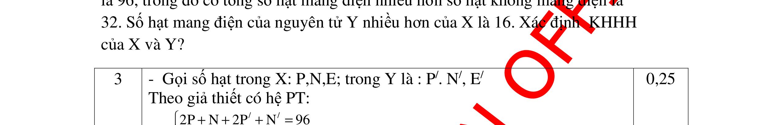 DẠYKÈMQUYNHƠNOFFICIAL Câu Hướngdẫnchấm Điểm 3 - Gọi số hạt trong X: P, N, E; trong Y là : P/. N/, E/ 0.25 Theo giả thiết có hệ PT: // // / 2PN2PN96 2PN2PN32 2P2P16 +++= −+−= −= -> / / 4P4P128 2P2P16 += −+= -> P= 12; P/ = 20 0.5 X là Mg; Y là Ca 0.25 Câu4. Một nguyên tử X có tổng số hạt dưới nguyên tử là 42. Tính số proton trong nguyên tử X và cho biết X thuộc nguyên tố hóa học nào trong số các nguyên tố có số proton sau đây: C: 6; N: 7; O: 8; Na: 11; Mg: 12; Al: 13; K: 19 . Biết trong nguyên tử X có 1 < p n < 1,5 . Câu Hướngdẫnchấm Điểm 4 Nguyên tử nguyên tố X có p + e + n = 42 mà p = e 2p + n = 42 n = 42- 2p. 0.5 Lại có 1< n p < 1,5 => 1< 422 p p < 1,5 1p < 42 – 2p < 1,5p 12 < p < 14 mà p là số nguyên nên p = 13 0.25 Vậy X là nguyên tố nhôm (Al) 0.25 Câu5. Nguyên tố X có tổng các hạt cơ bản là 82. Hạt mang điện nhiều hơn hạt không mang điện là 22. Xác định nguyên tố X. Câu Hướngdẫnchấm Điểm 5 X có : p + e + n = 82 mà p + e - n = 22 0.25 Mặt khác p = e → p = e = 26 → n = 30 0.5 → X là Fe : sắt 0.25