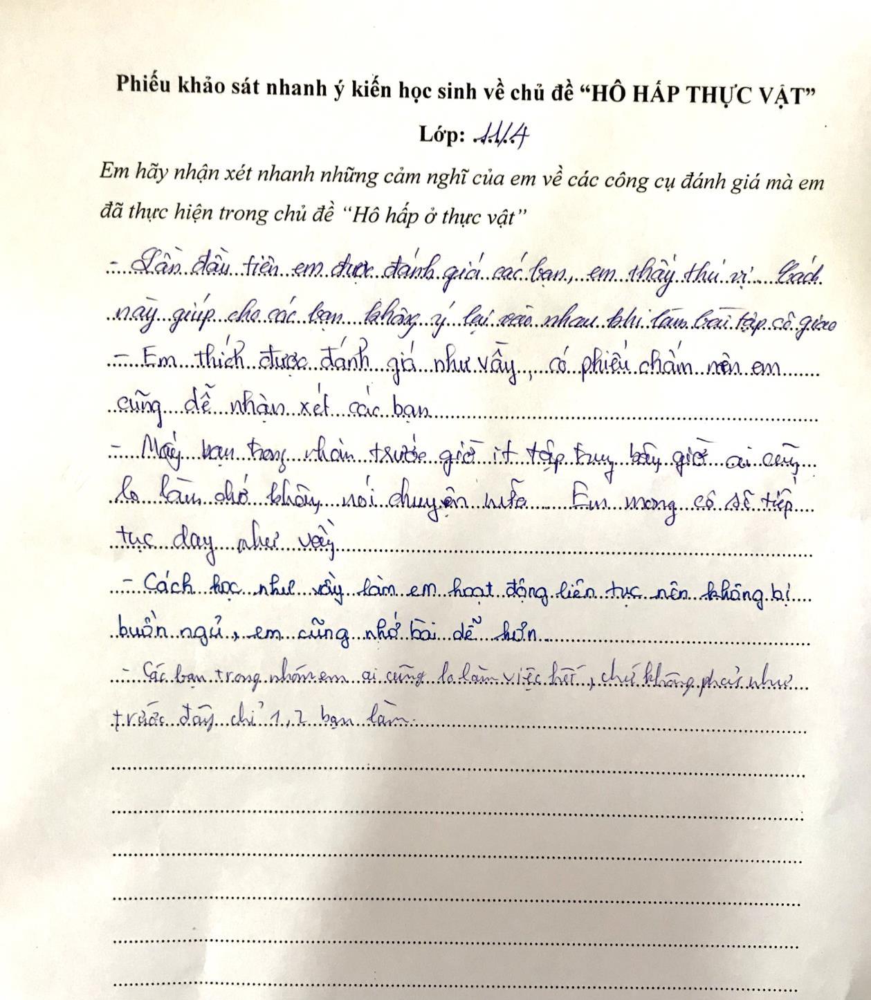 Qua những chia sẻ của các em học sinh từ phiếu khảo sát nhanh đã phần nào cho thấy tác động tích cực của các công cụ đánh giá thực hiện trong chủ đề, giúp các em rèn luyện tính chủ động, tự giác, tư duy trong hoạt động.
