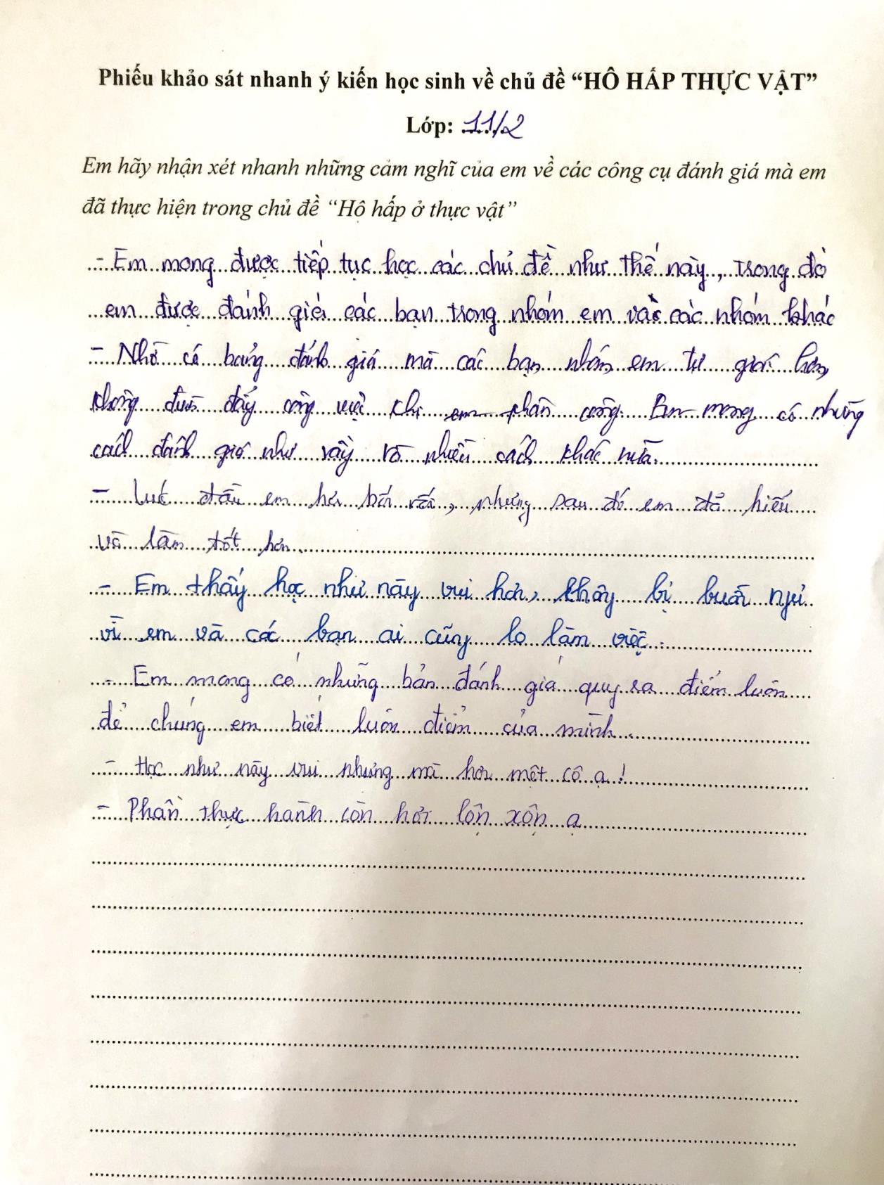 pháp và công cụ đánh giá trong chủ đề “Hô hấp ở thực vật” thông qua: Phiếu khảo sát trắc nghiệm. Xem Phụ lục 1. Phiếu đánh giá nhanh: Học sinh ngay sau khi học xong chủ đề “Hô hấp ở thực vật” được phát cho một tờ giấy trắng để ghi ngắn gọn (khoảng vài từ) nhận xét về chủ đề dạy học, hay đề xuất, góp ý dành cho người điều hành, ... 5. Kết quả khảo sát