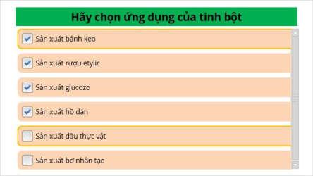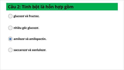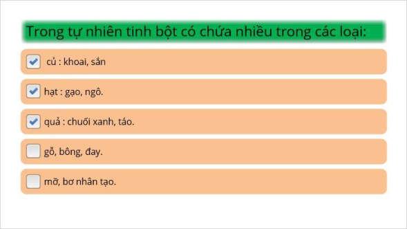 Hoạt động 3. Luyện tập a. Mục tiêu: - HS hệ thống hóa và củng cố lại kiến thức cơ bản về tinh bột. b. tổ chức thực hiện Bước 1. Chuyển giao nhiệm vụ: GV thiết kế 5 câu hỏi trắc nghiệm trên PowerPoint + trong phần mềm storyline 3 để tổ chức cho HS tham gia trả lời Bước 2. Thực hiện nhiệm vụ: HS trả lời nhanh các câu trắc nghiệm trên phần mềm.