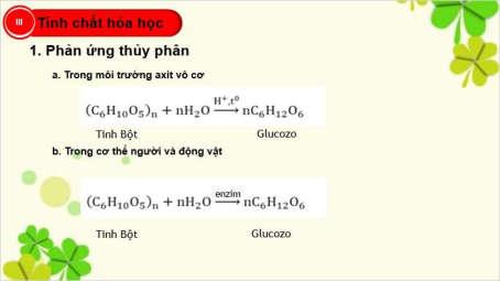 phân tử của tinh bột - HS: xem và ghi lại vào vở Bước 3: Sản phẩm: HS trả lời đúng câu hỏi trên và nắm được cấu trúc của tinh bột. c. Thiết bị số/ phần mềm được sử dụng: Máy tính/máy tính bảng/ điện thoại có internet; máy chiếu hoặc tivi thông minh; công cụ Google search, Zalo/Messenger ,Google classroom/ Microsoft Teams hoặc gmail; phần mềm Word, Microsoft Powerpoint để thiết kế và thuyết trình. Camtasia 9 làm video. Articulate storyline 3. Capcut. 2.5. Hoạt động 5: Tính chất hóa học 2.5.1. Phản ứng thủy phân a. Mục tiêu: HS biết được tính chất hóa học của Tinh Bột: phản ứng thủy phân,