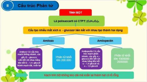 glicozit tạo thành mạch dài, xoắn lại, phân tử khối lớn khoảng 200000 Cấu tạo Amilopectin là gì? Và phân tử khối trong khoảng bao nhiêu? Có cấu trúc mạch phân nhánh do các đoạn mạch α – glucozo tạo nên bởi liên kết α - 1,4 – glicozit và α – 1,6 –glicozit, phân tử khối rất lớn: khoảng 1000000 – 2000000