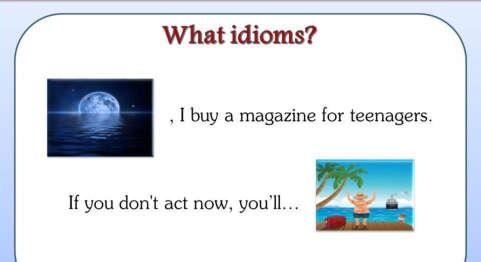 câu. Trong khi đó mấy ai trong năm học thỉnh thoảng cho các em thực hành một chút về thành ngữ. Có thể do sách giáo khoa cũ không có một tiết language focus nào nói riêng về Idioms. Vì vậy thường thường giáo viên đến