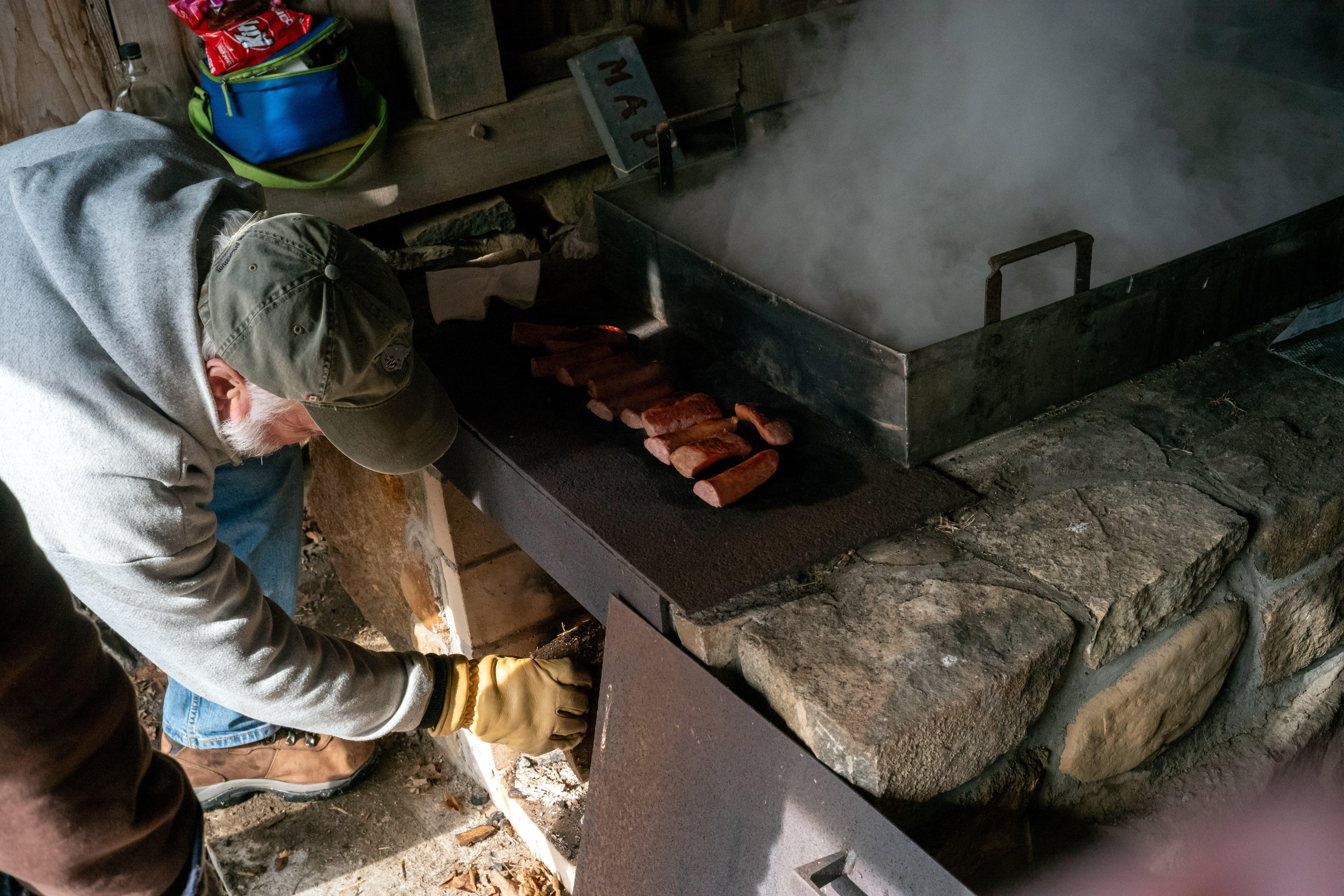 Jim Powers of Dudley Farm in Guilford stokes the firebox of an evaporator as steam rises from boiling sap during a maple sugaring demonstration Feb. 15. The process requires about 40 gallons of sap to produce one gallon of maple syrup.