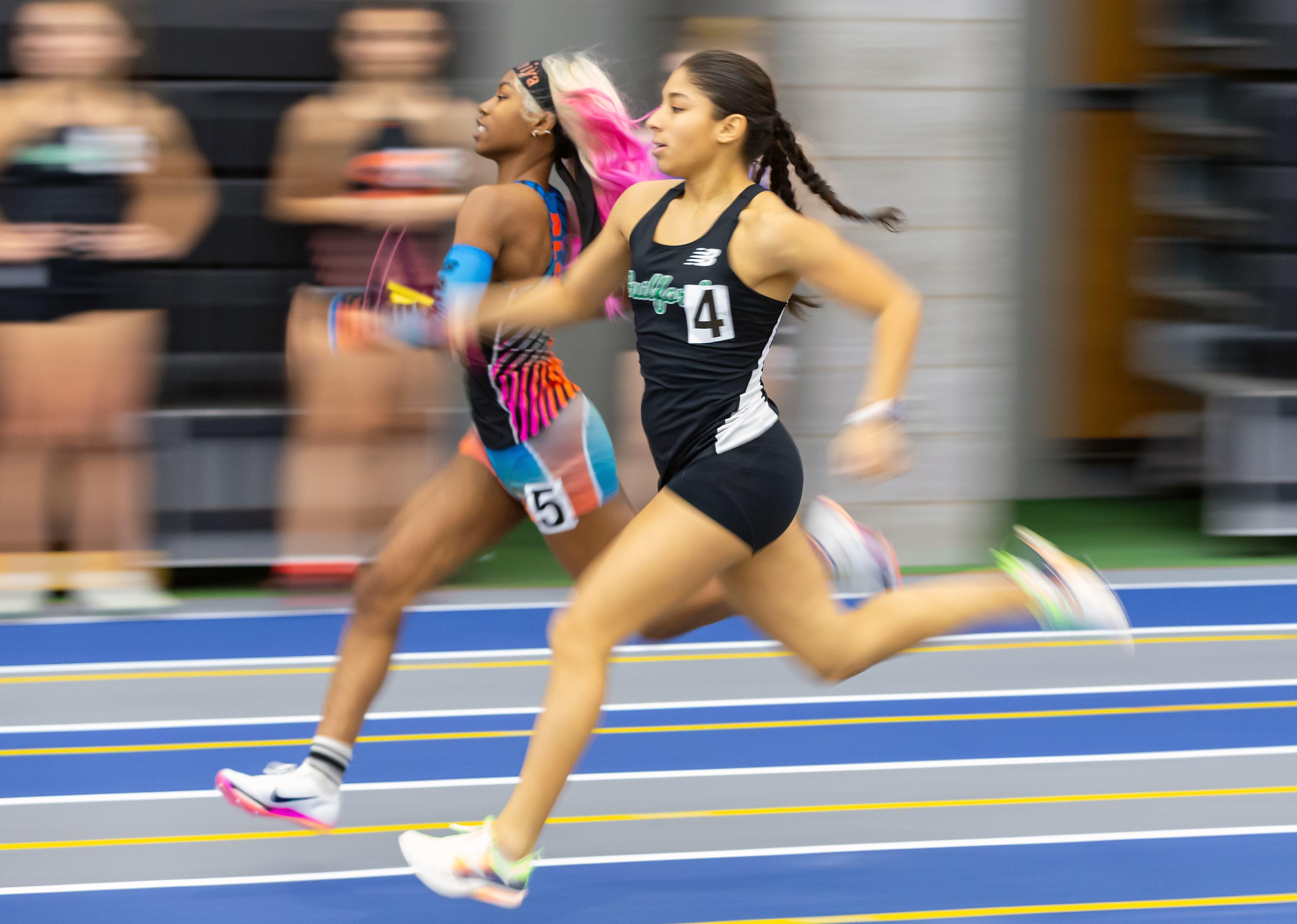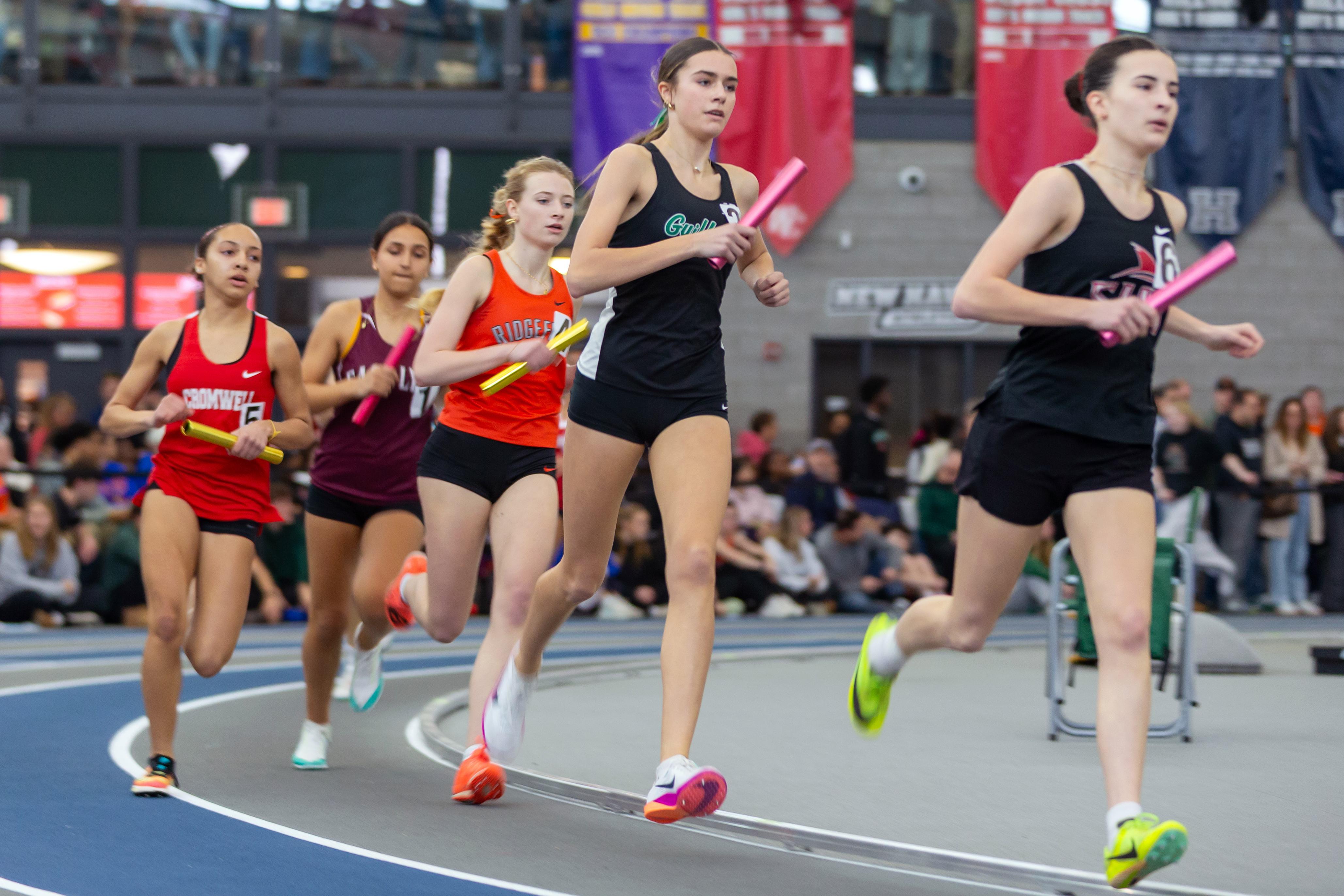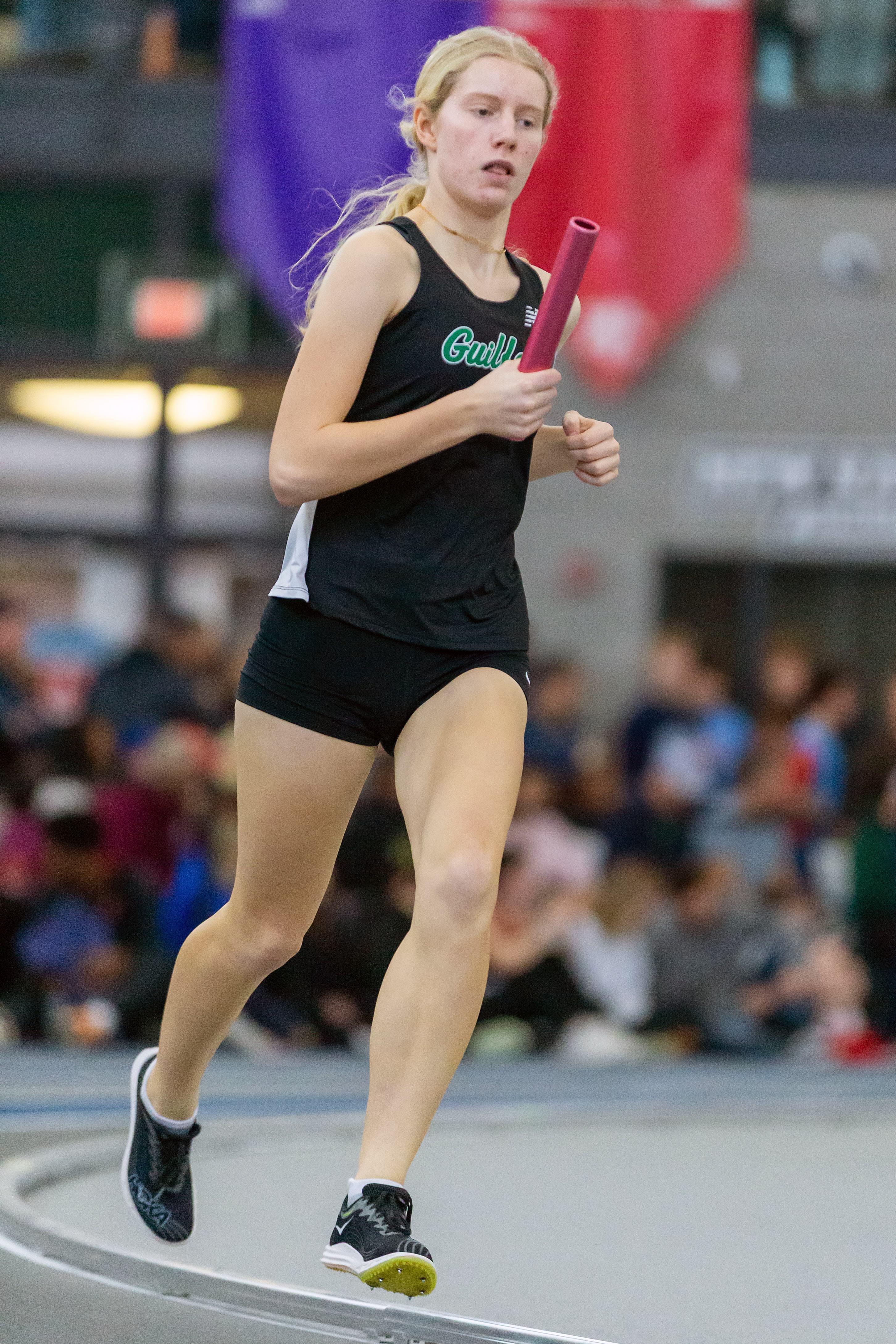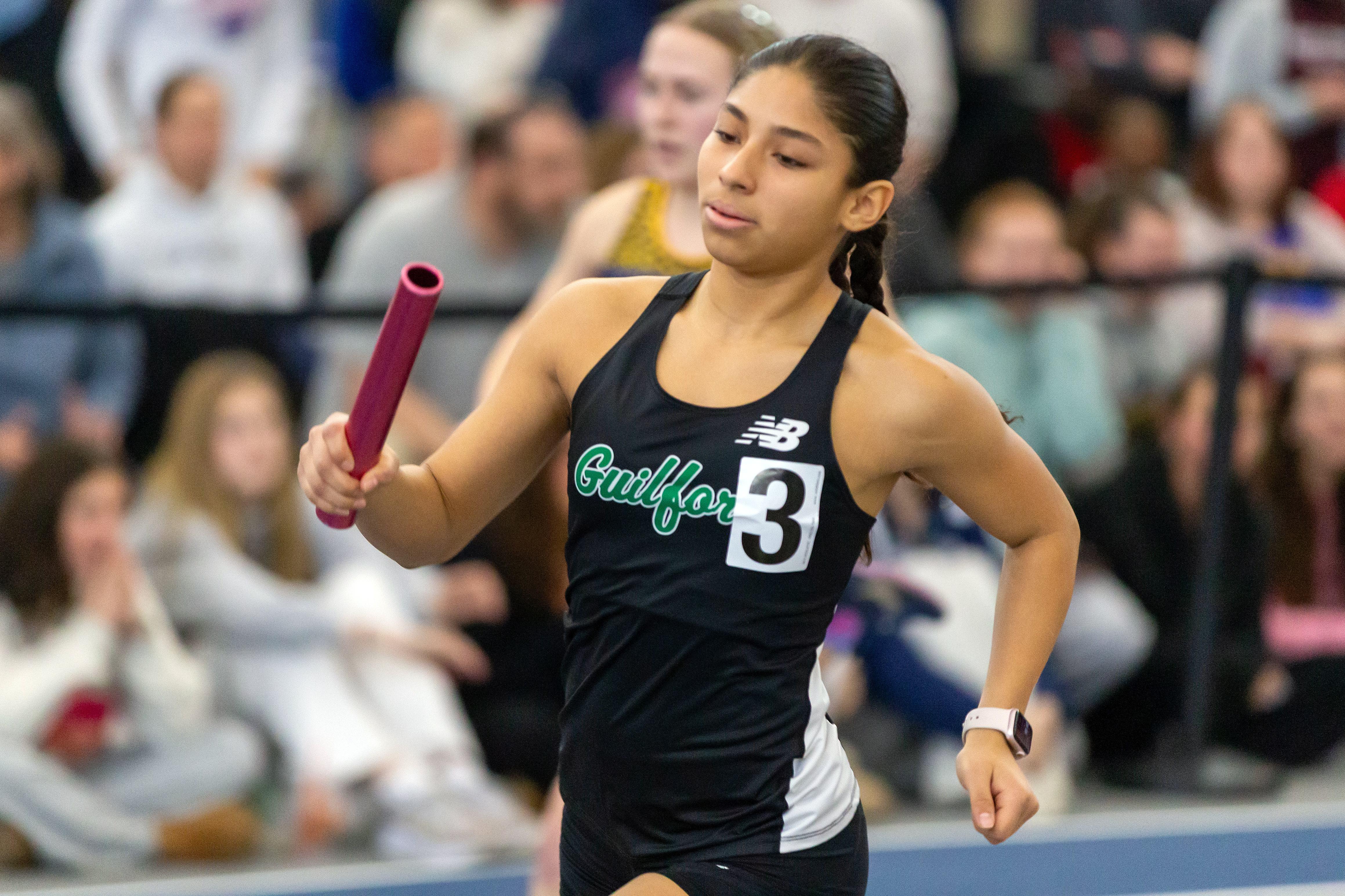 Guilford’s Madelaine Aguilar runs the opening leg of the girls 4x400meter relay during the CIAC State Open Championship on Feb. 21 at the Floyd Little Athletic Center in New Haven. The Grizzlies finished in 4 minutes, 9.65 seconds. The relay team includes Aguilar, Ashlyn Meehan, Anna Gunderson and Kaylin Diglio.