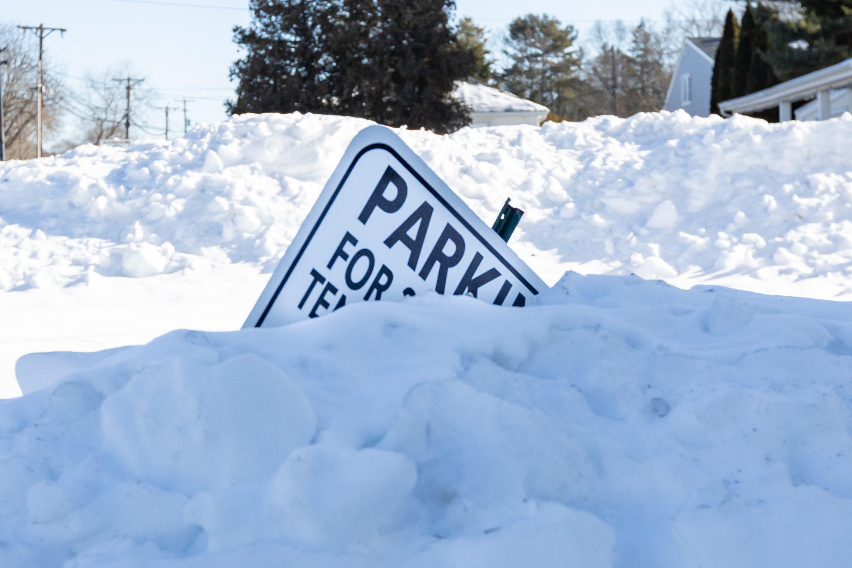 A parking sign leans half-buried in the snow on Main Street in Clinton on Feb. 9 after more than two weeks of extreme cold. Morning temperatures hover around 17 degrees, with wind chills frequently dipping below zero. The state’s Severe Cold Weather Protocol, activated Jan. 23 to protect residents at risk of cold-related illness or death from exposure, marks its longest continuous activation since 2015.