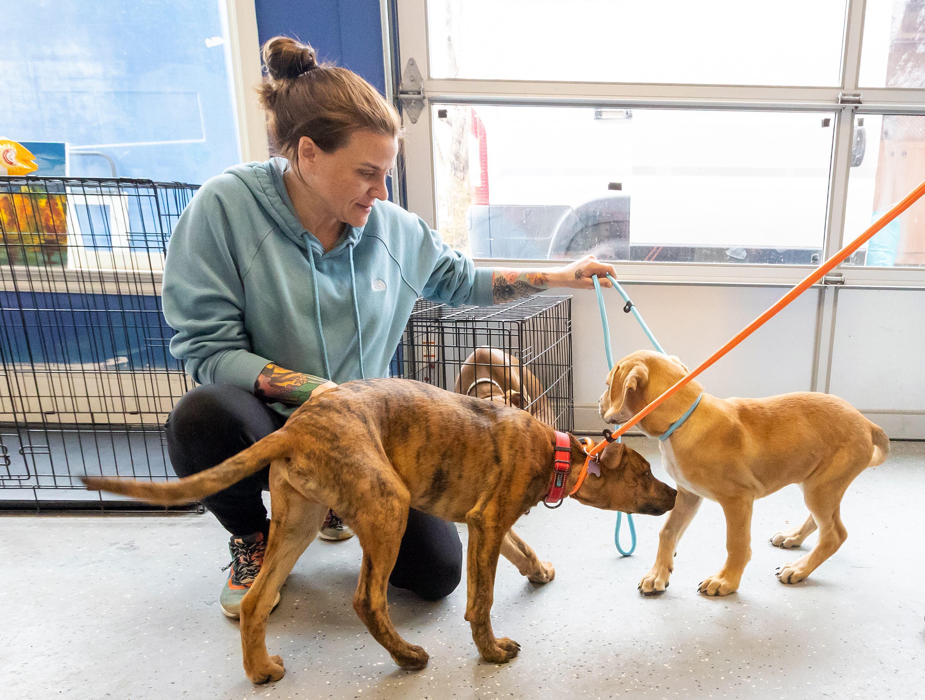 Robin Esposito, founder of Operation Save the Paws Rescue, tends to Copper and other adoptable dogs during an adoption event at Kaleidoscope, a Chester art collective, on March 8. The event partners with Kaleidoscope as part of the collective’s one-year anniversary community give-back effort.
