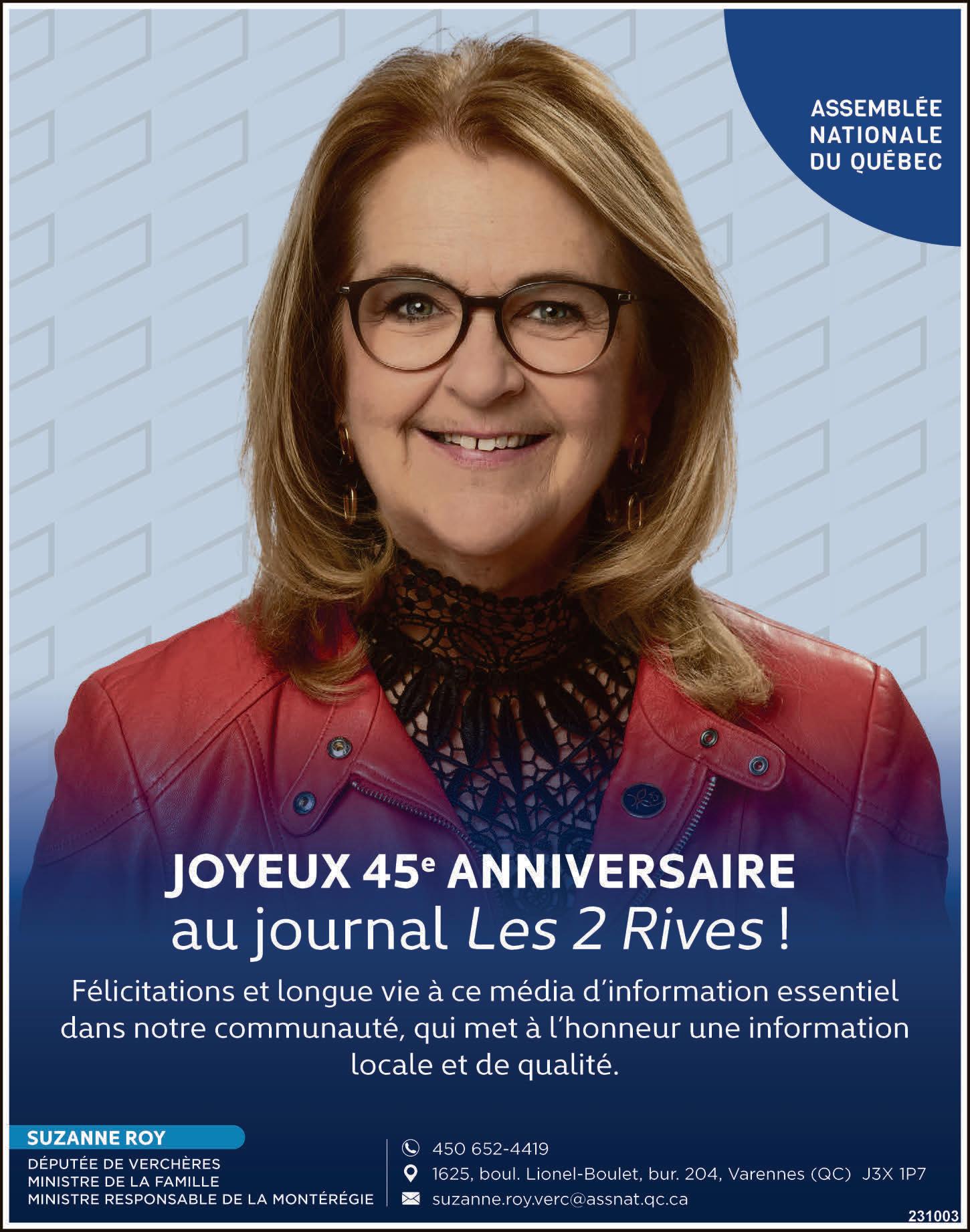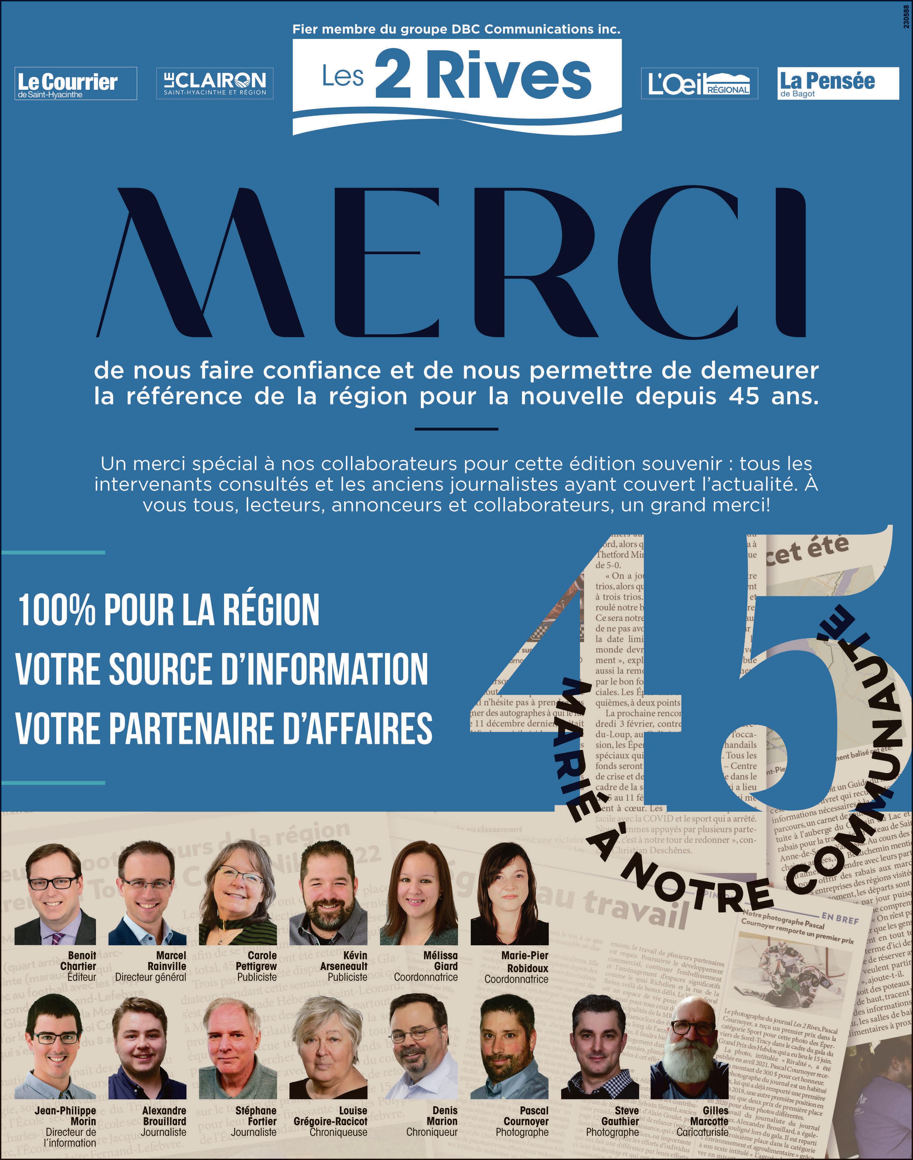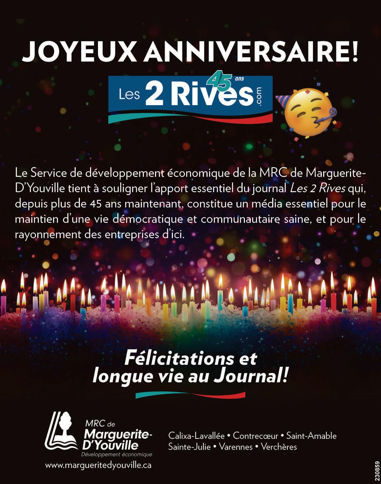 Il n’y a pas de petit anniversaire dans la vie d’un être humain et encore moins dans la vie d’un média d’information comme le nôtre. C’est pourquoi, alors que nous cheminons vers notre 50e anniversaire, nous n’allions certes pas rater l’occasion de souligner les 45 ans du journal Les 2 Rives.