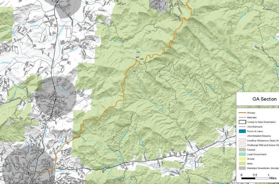 This planning section stretches approximately 8.5 miles from Hale Ridge Road near the North Carolina/Georgia State Line to Wilson Gap in the Chattahoochee National Forest. The primary proposed alignment follows the Bartram Trail from Hale Ridge Road along the ridgeline through Beegum Gap and over Rabun Bald before ending at Wilson Gap.