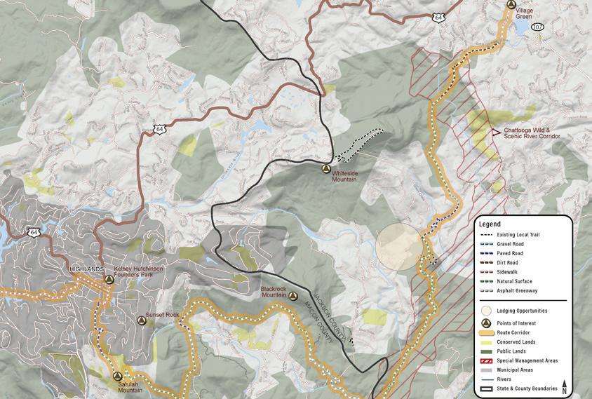 During the route review and assessment process, additional trail opportunities may be identified and developed to provide connections to other natural assets and points of interest specifically including Whiteside Mountain and other local waterfalls, peaks, and rivers.