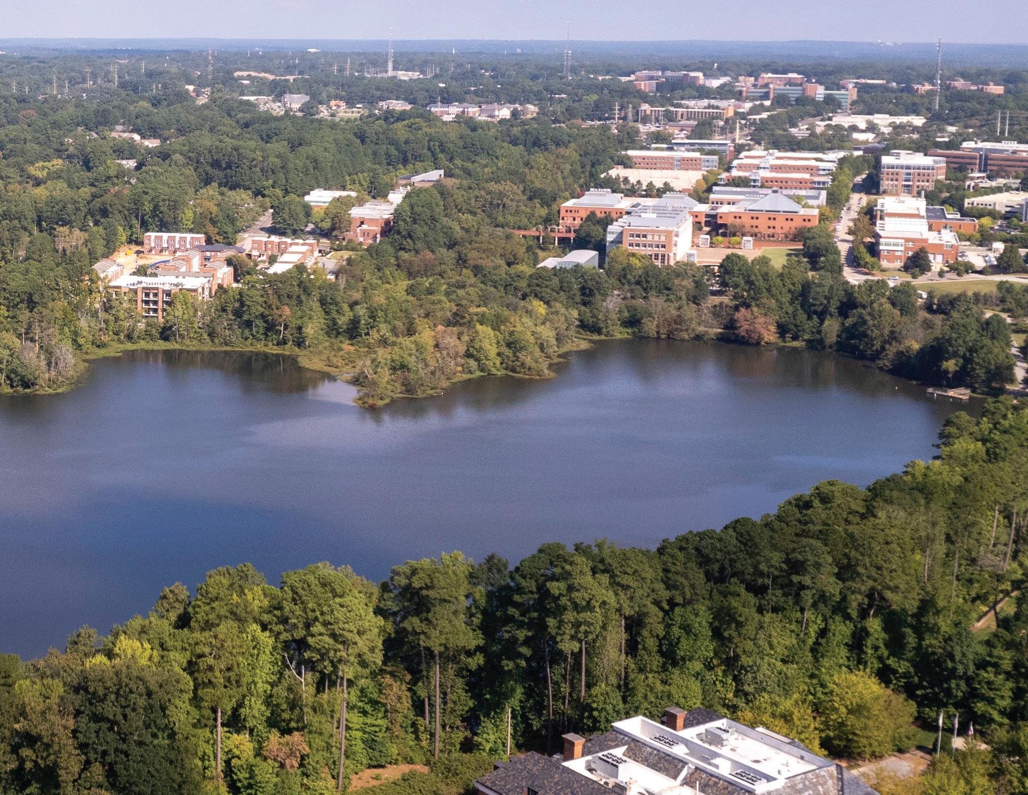The growing campus community blends academic and office facilities, residential living, and recreation opportunities, including restaurants, a hotel, and public golf course all situated near Lake Raleigh.
