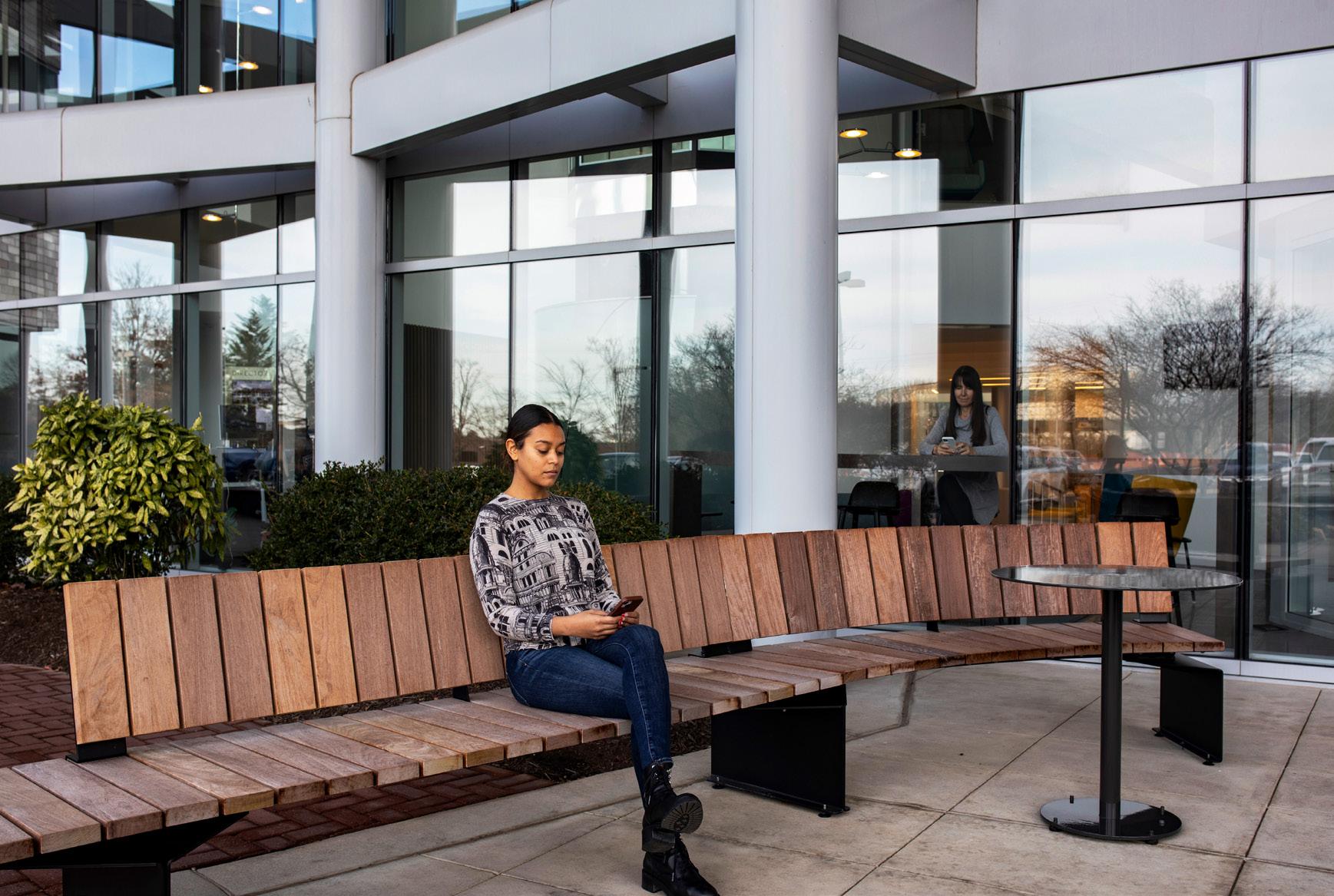 DBI was approached by Bristol Capital Corporation to renovate the building’s main lobby and bring new purpose to the outdated space. Prior to renovation, the lobby space was primarily a sitting area with no significant functionality for the tenants of the building. The main lobby is fragmented into three unique pockets of space by the two separate elevator towers. DBI’s designers envisioned the three connected spaces each with their own function. A palette of bright white, exposed concrete, specialty prefinished metals, and warm wood tones is highlighted by furniture in bold accent colors that bring a bright and vibrant energy that invites users into the space. Design in the north lobby included a reception desk at the main entrance to accommodate security needs and a multifunction seating area. The south lobby was equipped with banquette and bar-height seating that can accommodate dining, working, relaxation, or small meetings. The central lobby was completely reimagined, turning it into a well-lit multifunction area with banquette seating built into the stairs and adding a lighted design element that span across the ceiling and along both walls, creating visual interest, drawing users into the space, and connecting the north and south lobbies and improving the flow and cohesiveness of the space.