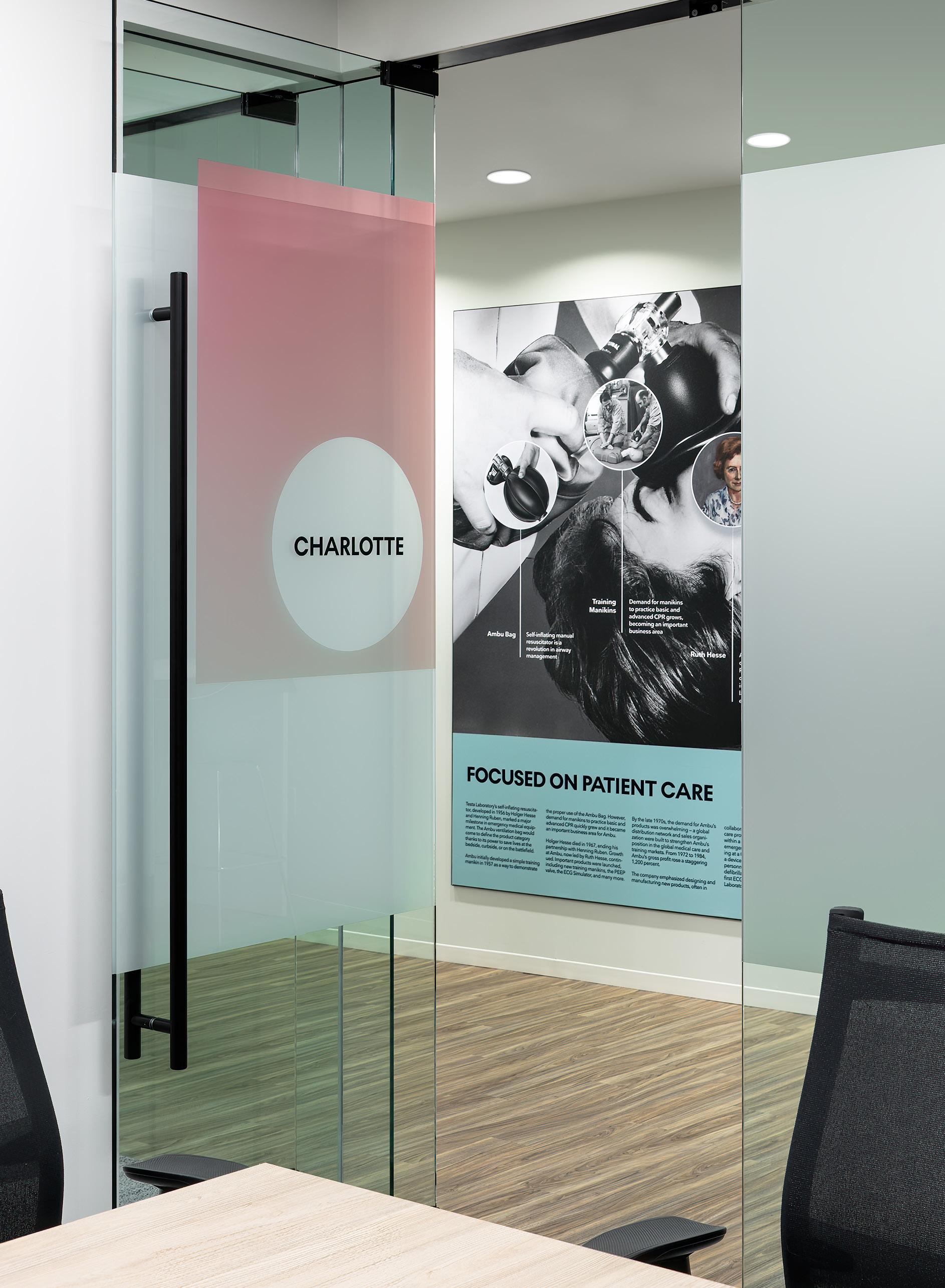 A simulation lab was created as part of this “brand-forward” approach. Displaying much of Ambu’s groundbreaking technology for outpatient care, operating theater, and emergency room, the sim lab is integrated into the reception area, through a glass partition.