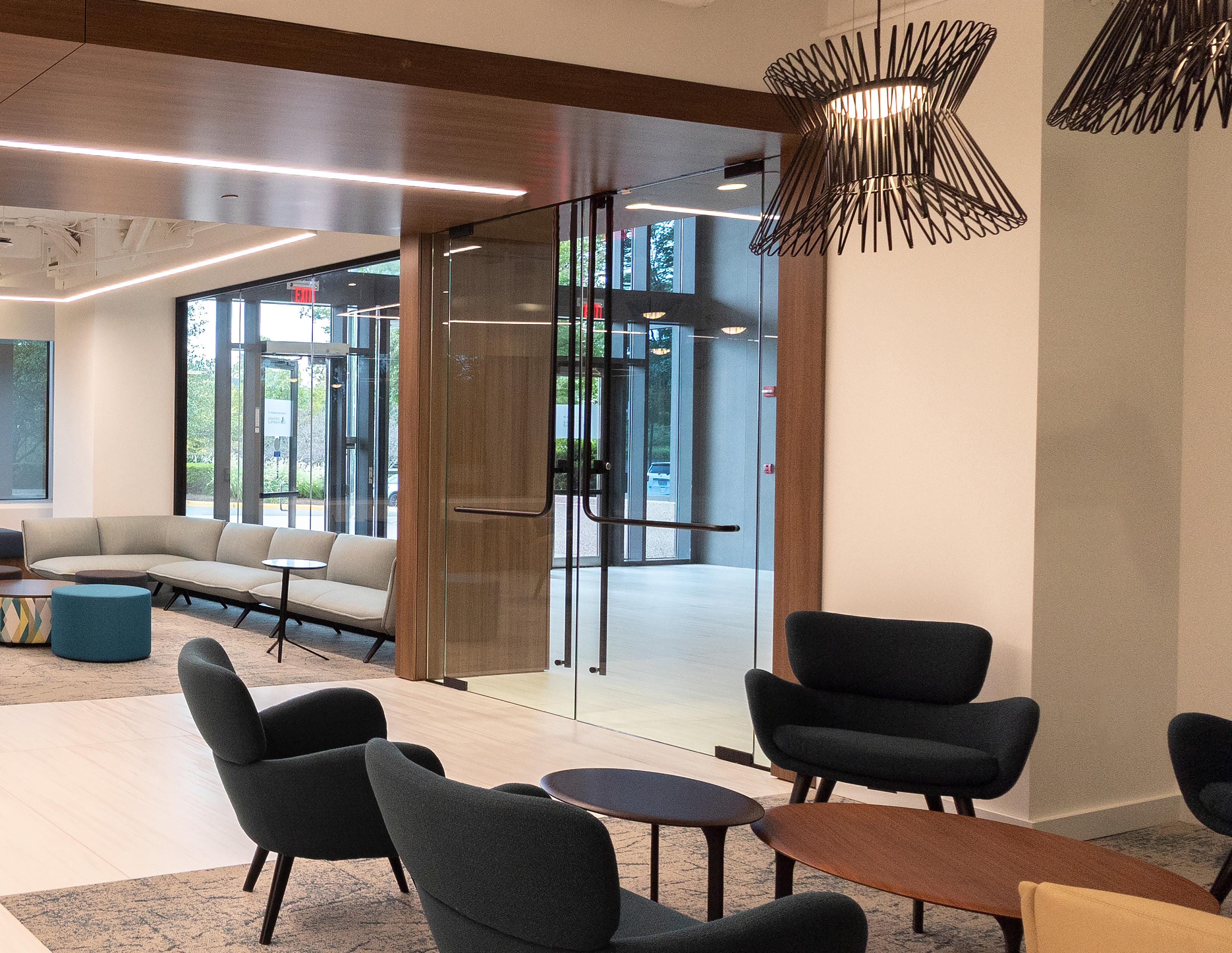 DBI undertook several projects at 2900 Crystal Drive including the revivification of the main lobby, creation of a tenant lounge, and improvement of the building’s exterior presence to improve the experience for current tenants and to attract new tenants to the building. Just off the main lobby, an outdated 2,301-SF office space was converted into a comfortable and modern lounge for tenants. The new space features a coffee bar, flexible open seating area, arcade games, and a fireplace lounge. Open plenum ceilings and a glass entry to the lounge create a visually uninterrupted experience. A custom solid oak trellis with integral lighting acts as an anchor, creating a relaxed and cozy spot for tenants. This renovated space creates new flexible options for all tenants; whether a staff event, grabbing a cup of coffee in the morning, team collaboration through a quick game break, or conducting private meetings, the new tenant lounge is designed to fill a range of needs. The interior trellis design was carried over into the outdoor lounge space, and the mixture of high-top tables and lounge seating, string lights, and lanterns makes the building an appealing oasis along Route 1. The main lobby was expanded to 4,339 square feet, finishes were brightened and modernized featuring custom glass panels and lighting, and bar-height tables, divider panels, and live edge oak window ledges create additional flexible spaces for tenant use.
