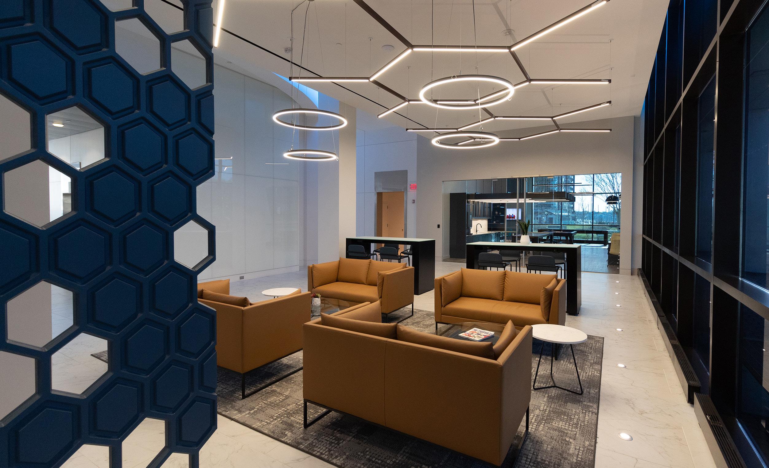 At ACA, the workplace has been reinvented for the post-COVID world. The design of this highly adaptable and flexible hybrid workplace is 50% collaborative and 50% offices/workstations, treating the office as a “destination” for meetings and collaborative work. The fresh, new space is open and airy. Vibrant teal, deep blues, chartreuse green, and gray set off breakrooms, huddle rooms, and conference rooms, bringing a playful yet concentrated vibe to smaller areas within the larger space. Glass walls ensure that natural light from the perimeter permeates to the core. Innovative solutions were used for accent and direct lighting. All seating is comfortable and attractive, yet ergonomically designed. All desking is height adjustable, with ample built-in plugins for electronics. Desking throughout must be reserved, and lockers are provided to minimize clutter.