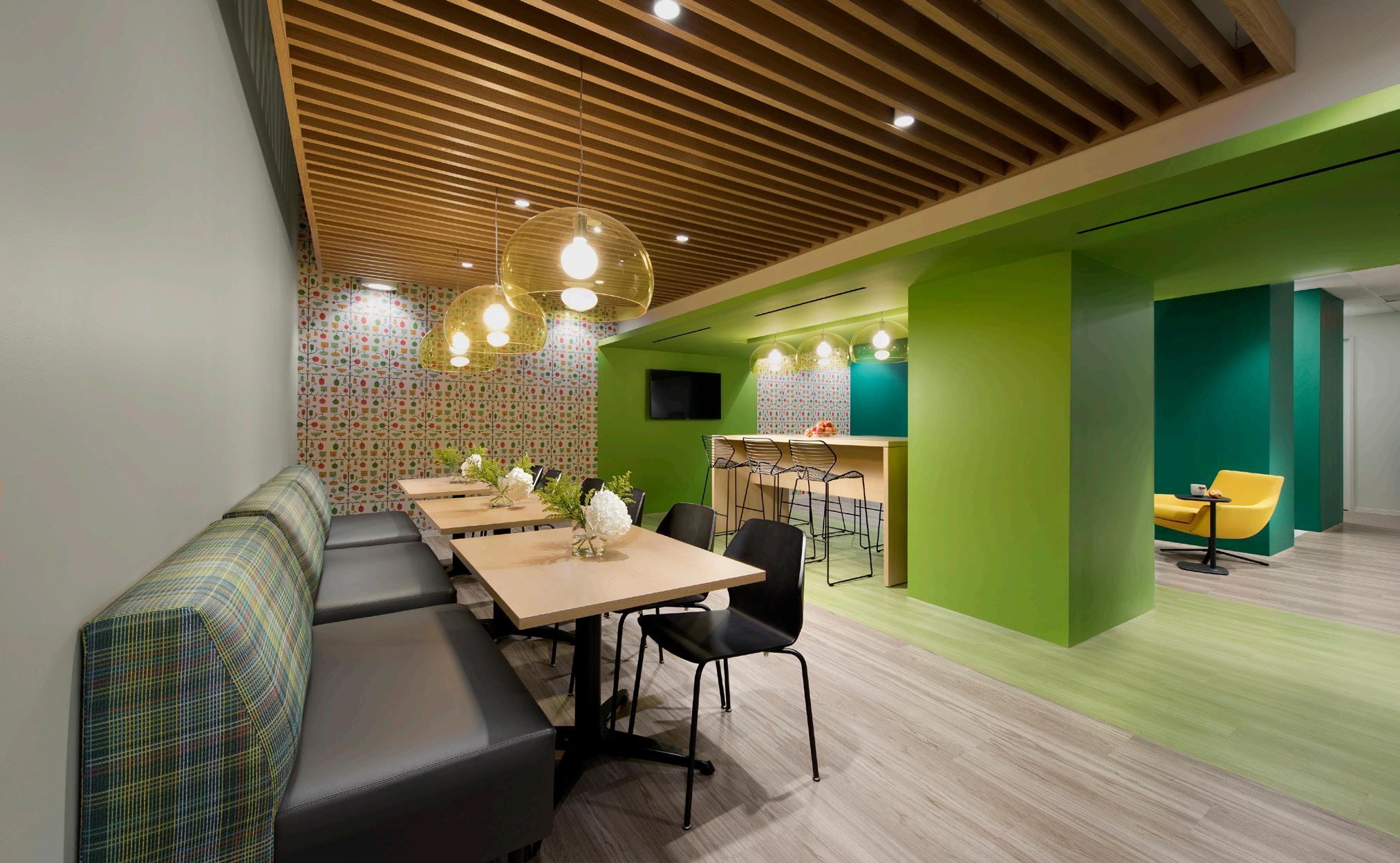 At ACA, the workplace has been reinvented for the post-COVID world. The design of this highly adaptable and flexible hybrid workplace is 50% collaborative and 50% offices/workstations, treating the office as a “destination” for meetings and collaborative work. The fresh, new space is open and airy. Vibrant teal, deep blues, chartreuse green, and gray set off breakrooms, huddle rooms, and conference rooms, bringing a playful yet concentrated vibe to smaller areas within the larger space. Glass walls ensure that natural light from the perimeter permeates to the core. Innovative solutions were used for accent and direct lighting. All seating is comfortable and attractive, yet ergonomically designed. All desking is height adjustable, with ample built-in plugins for electronics. Desking throughout must be reserved, and lockers are provided to minimize clutter.