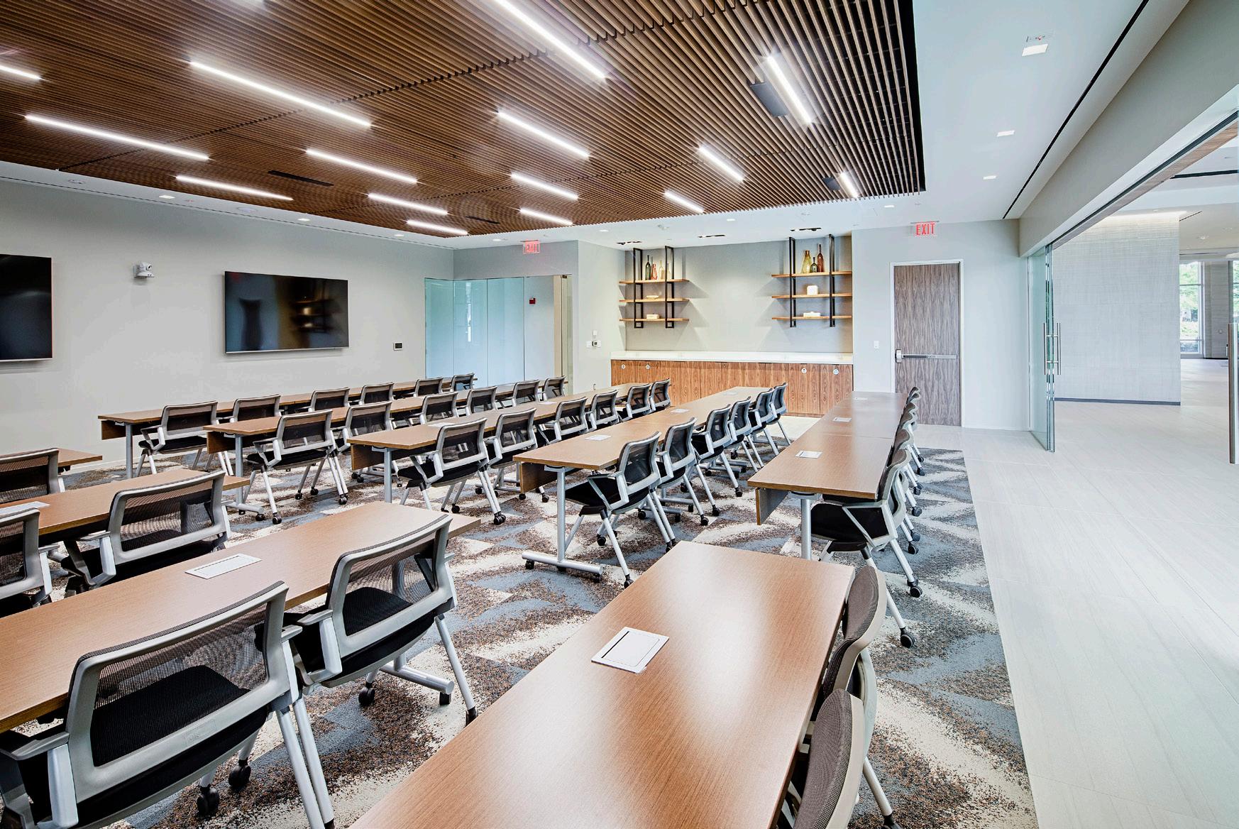 An open and airy atrium design welcomes the visitor with plenty of light, activating the space in a human-scale, collaborative, multifunctional design that is flexible enough to accommodate anything from an intimate collaboration to large events. Positioning the brick construction elements as a “feature” in the stairway, penthouse, and common areas resonates with the historical importance of the site, near the center of the City of Alexandria, VA, at the original location of the Alexandria Hospital. Acoustic challenges in the atrium were addressed, through the use of rugs which delineate areas, movable media towers, and sound-absorbing furniture. An amenity room at the penthouse level includes a Golf Simulator lounge.