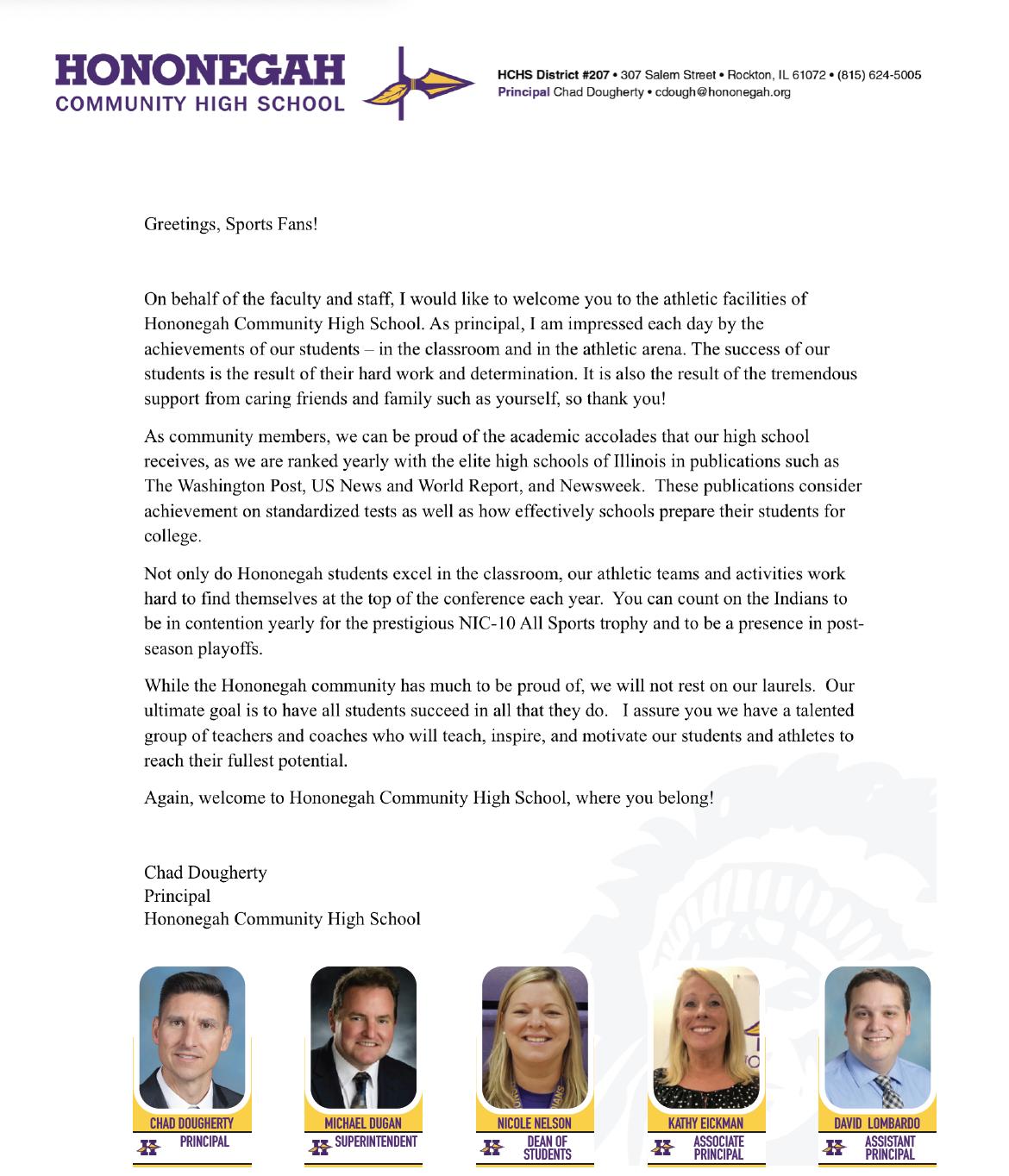 The 2022-2023 school year should be an exciting one for our student athletes. Each of them has put forth their best effort to be the best that they can be in their respective sport or activity. All of us can be proud of the efforts that our young people and the Hononegah coaching staff put forth each year. It is through their hard work and dedication that Hononegah continues to be recognized as an area leader in academics and athletics. The success of our teams and its members is a partnership between the players, coaches, parents, and community. In