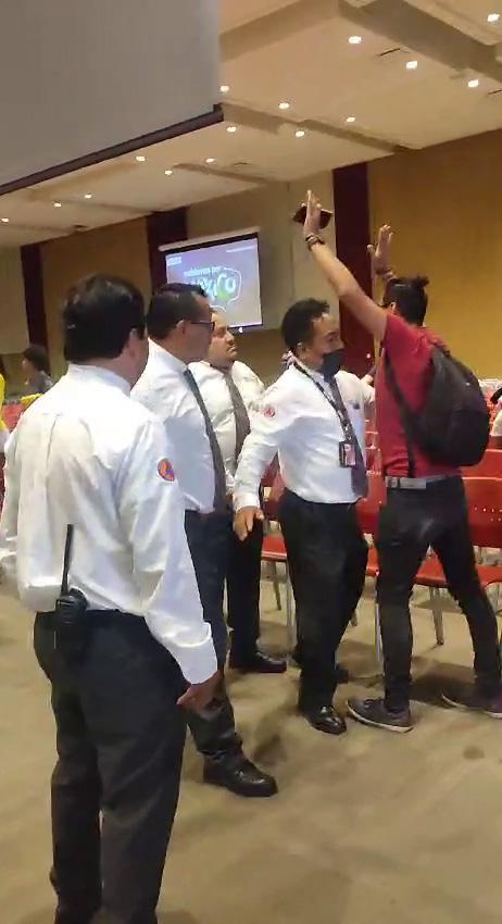 de hasta ocho guardias de seguridad, quienes lo rodean y lo jalonean sin ninguna justificación.