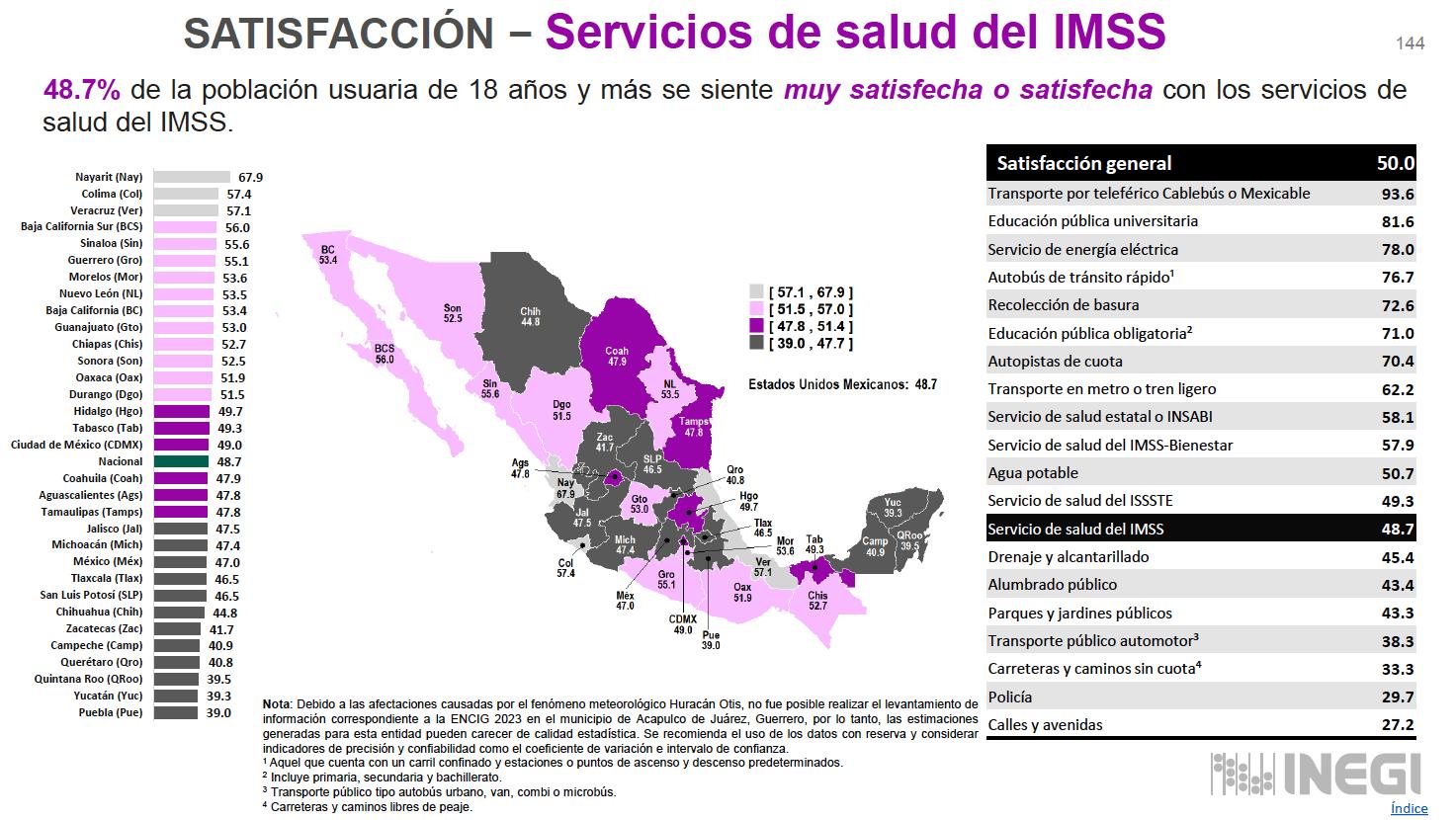• EN CONTRASTE EL SISTEMA ESTATAL DE SALUD TENÍA UNA SATISFACCIÓN DEL 56 % de acuerdo al ENCIG 2023 del INEGI, pero desapareció con la entrega de todos sus inmuebles y personal al instituto
