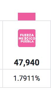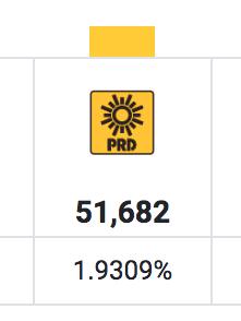 Partido: Número de votos a presidencias municipales: Porcentaje de votos a presidencias municipales: Número de votos a diputaciones locales: Porcentaje de votos a diputaciones locales: 54 mil 275 votos 2.09 por ciento 51 mil 502 votos 1.92 por ciento 78 mil 757 votos 2.93 por ciento 60 mil 713 votos 2.26 por ciento 61 mil 669 votos 2.29 por ciento 47 mil 937 votos 1.79 por ciento 80 mil 500 votos 2.99 por ciento 56 mil 456 votos 2.10 por ciento