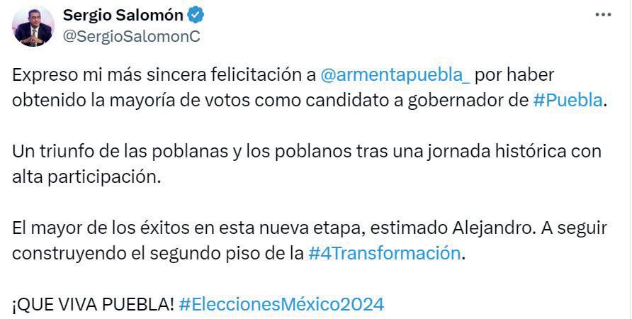 “Expreso mi más sincera felicitación a Alejandro Armenta por haber obtenido la mayoría de votos como candidato a gobernador de Puebla. Un triunfo de las poblanas y los poblanos tras una jornada histórica con alta participación. El mayor de los éxitos en esta nueva etapa, estimado Alejandro. A seguir construyendo el segundo piso de la cuarta Transformación”, señaló el mandatario poblano.