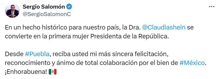“Extendemos nuestras más sinceras felicitaciones a la doctora Claudia Sheinbaum. El pueblo de México expresó su voluntad en las urnas, otorgándole una abrumadora ventaja a la candidata de la coalición ‘Sigamos haciendo historia’ en la elección presidencial”, escribió el mandatario poblano.
