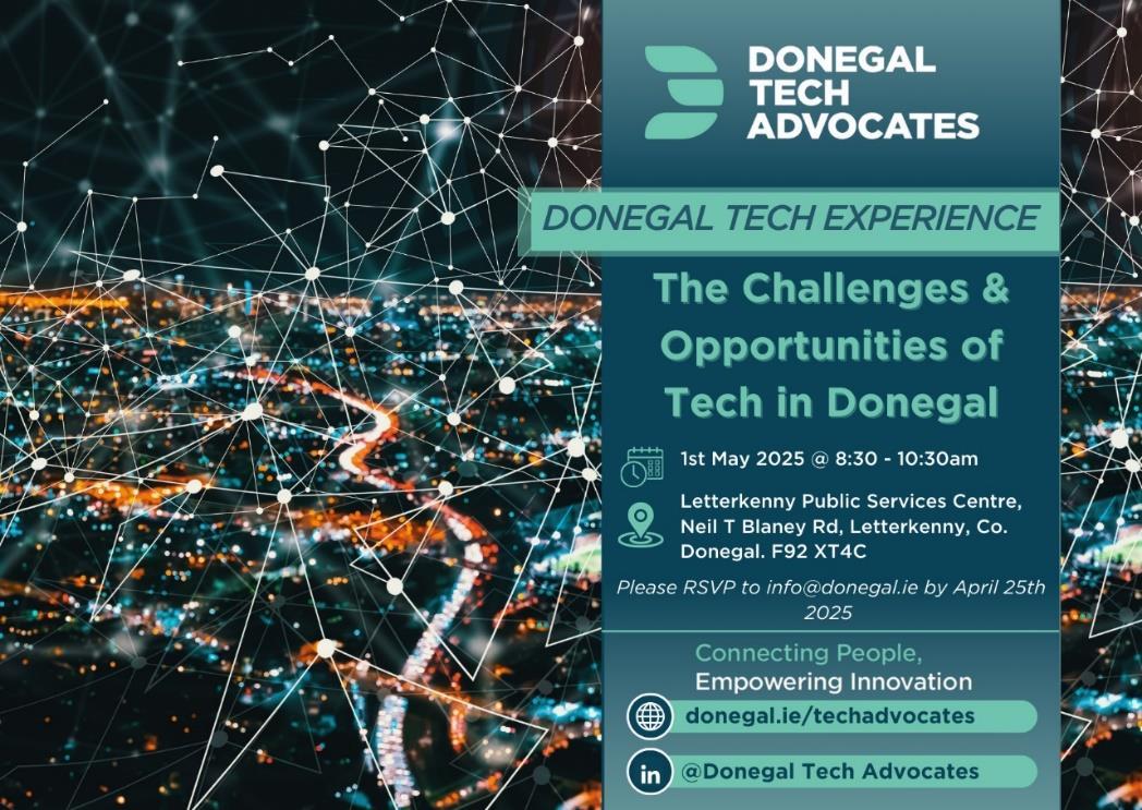 The Donegal Tech Advocates hosted a networking event on 1st May 2025 at the Letterkenny Public Service Centre, bringing together tech entrepreneurs, professionals, and supporting organisations from across the county. Donegal Tech Advocates is an industry-driven network aimed at connecting and supporting the local tech ecosystem, fostering innovation, collaboration, and the sharing of knowledge to help Donegal’s tech sector grow and succeed.