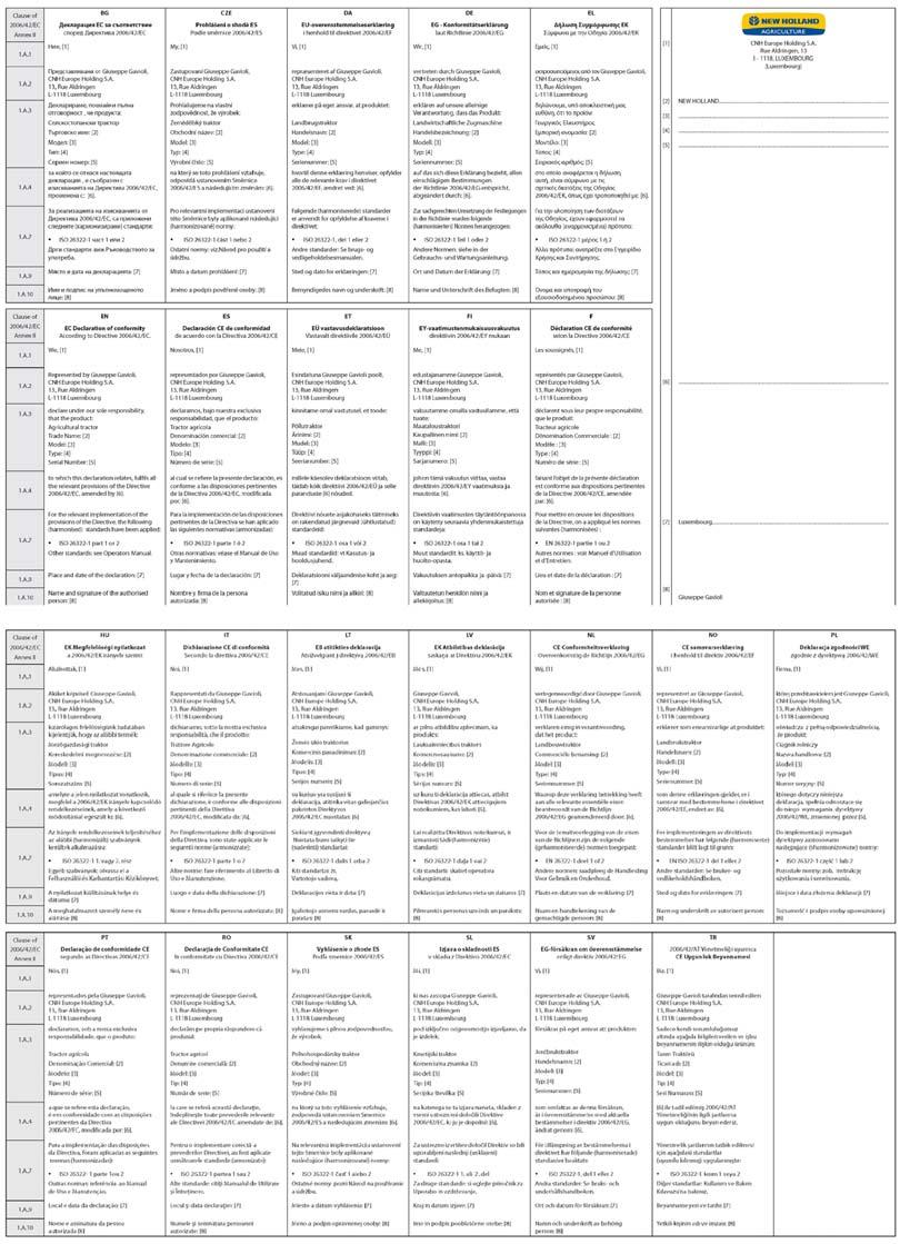 Allotherusewillbeconsideredtobecontrarytothe usespecifiedbyNEWHOLLAND,whocannotbe heldliablefordamagetopropertyorthemachine,or forpersonalinjurieswhichmayresult.