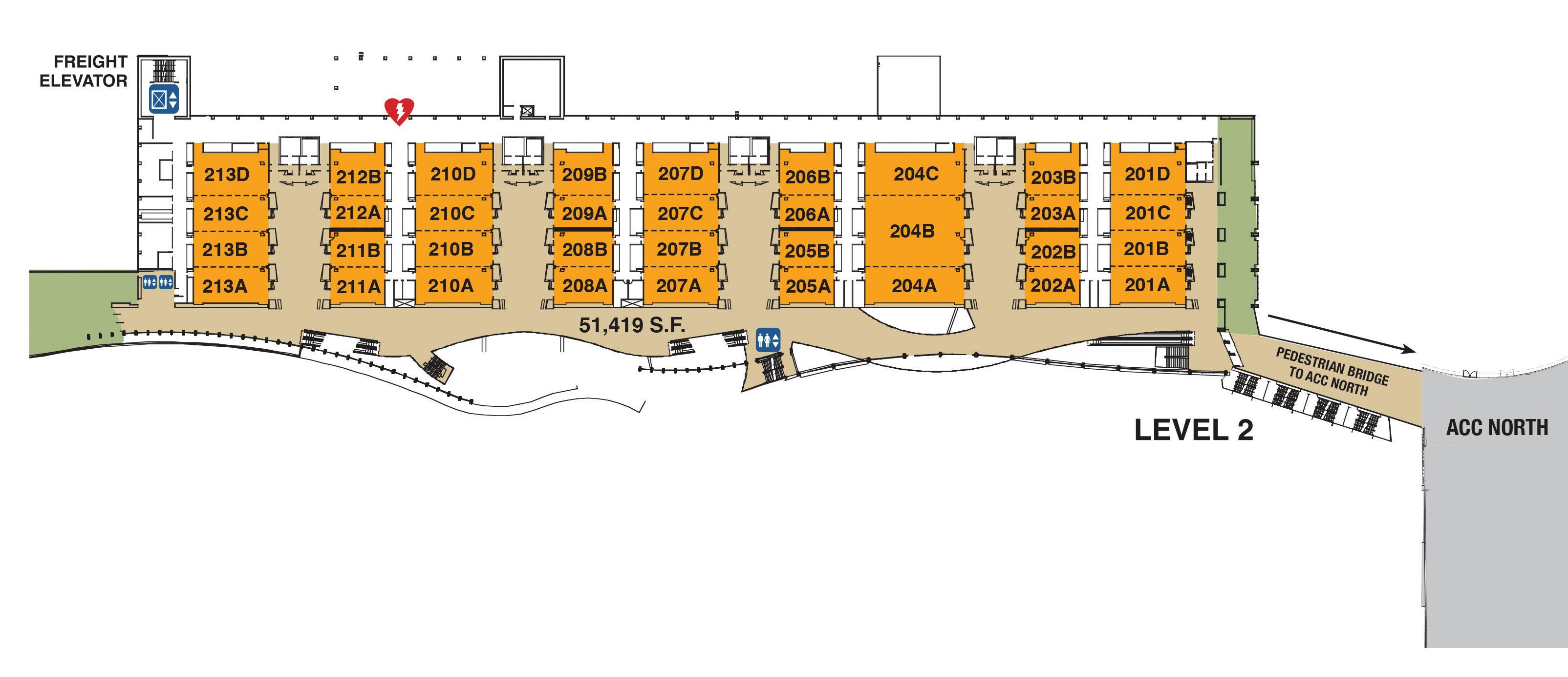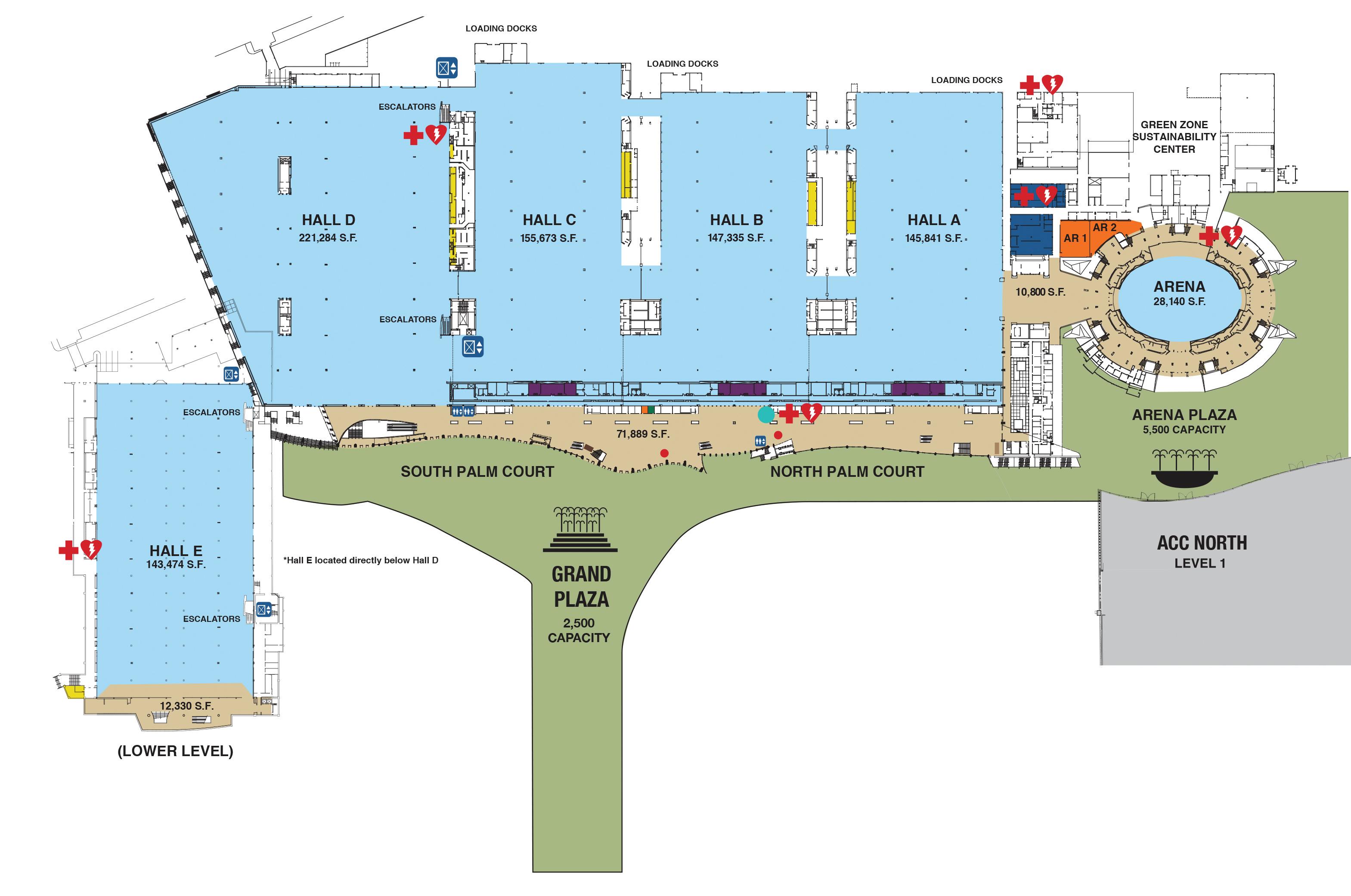 • ADA Accessible Doors: 15 push-button doors are available for easy access and are located at key entry points, including Exhibit Halls A to E, and both ACC North and ACC Lobby entries.