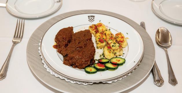 On the second day, the marinated piece of meat is dried with a cloth or napkin and flash-fried in hot oil (some people even use heated lard), in order to create a thin crust and re tain all the aromas in the meat itself. Strain the vegetables from the mari nade, and prepare the marinade for stewing. Place the rest of the onions that are not used for the marinade on the frying fat and gently fry until they become glazed. Now add the vegetables from the marinade and the rest of the chopped vegetables. Simmer until the vegetables „wither“. Add meat, marinade and vegetable stock. Now add dried figs, prunes and nutmeg.