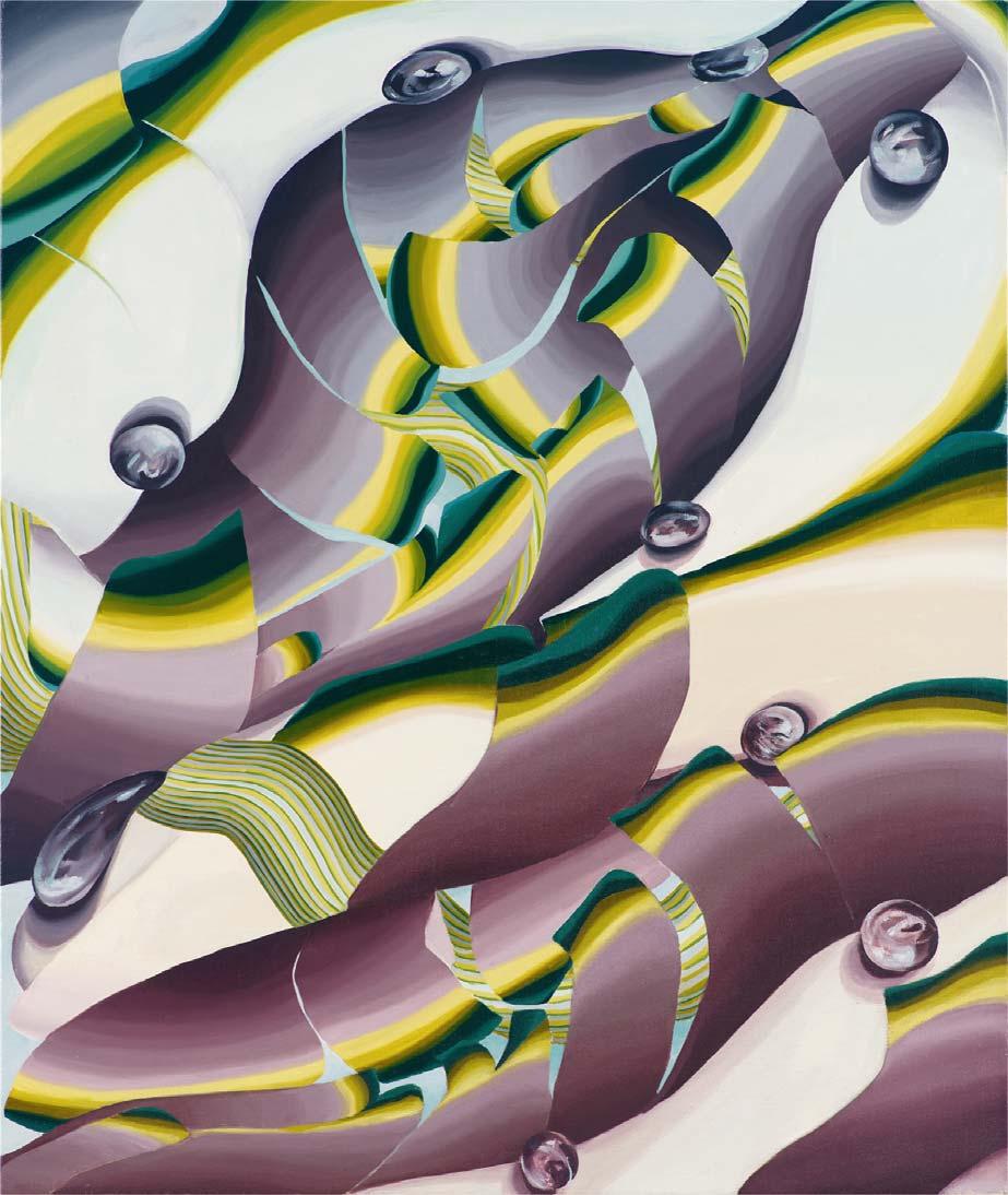 THERESA DADDEZIO ’S PAINTERLYINVESTIGATIONS of abstraction and its taxonomies are testaments to the interspecial epoch in which we live. Ecologies and economies shape these painterly ideas—freeflowing interpretations of the natural world transform texture and color into optical scenographies which knit improbable worlds together. Despite their complexity as abstractions, the planar realities invoke plausible, visual environments. Interwoven, nonhierarchical, and symbiotic surfaces bring tactile environs into view. Vibrant ribbons, textural fields of color, and chromatic tensions are manipulated and interpellated. It is from this place of artificial-real physicality—from the harmony of human and nonhuman, organic and inorganic—that Daddezio finds kinship. We sat down in her studio and discussed everything from biological motifs, fantasy, digital influence, divinity, to worlding.
