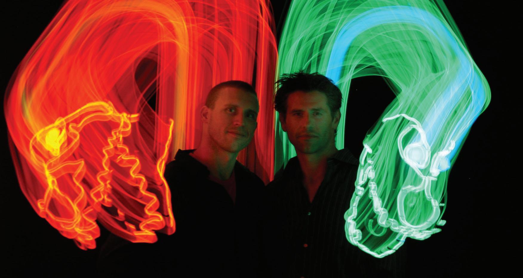 Lightwire co-creators Ian Carney and Corbin Popp met in New York City while dancing in Twyla Tharp’s Movin’ Out on Broadway. An immediate connection was made between the kindred spirits as they discovered their mutual love of art, theater, and technology. After coming across a product called, “el wire,” the lights turned on and the possibilities seemed endless. Together, with their wives Eleanor and Whitney, they began to experiment with shapes and designs to develop puppetrybased neon creatures that quickly came to life.