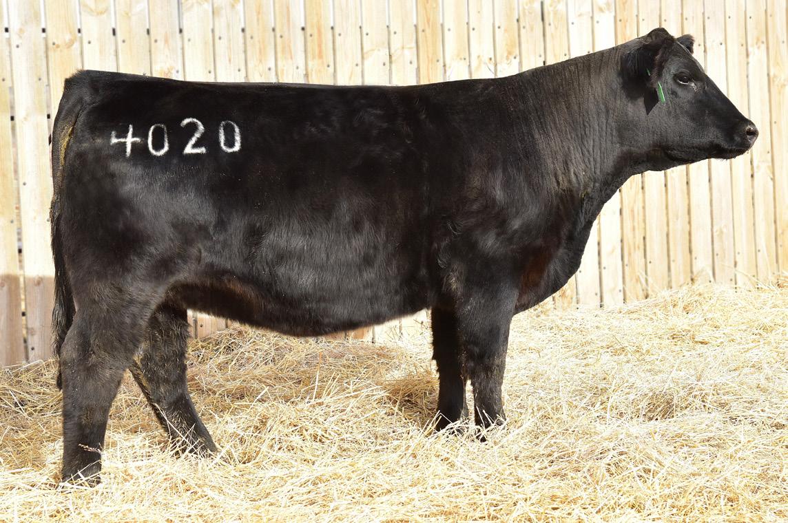 4020M is moderate-framed, yet long-spined, with plenty of depth of body and overall balance. She is a maternal sister to Lot 62 and their dam entered the donor line up this past spring. Her EPDs rank in the top 20% for DMI and top 30% for CW. Expected calving date: 4/16/2026; safe to FAR Bandolier 421.