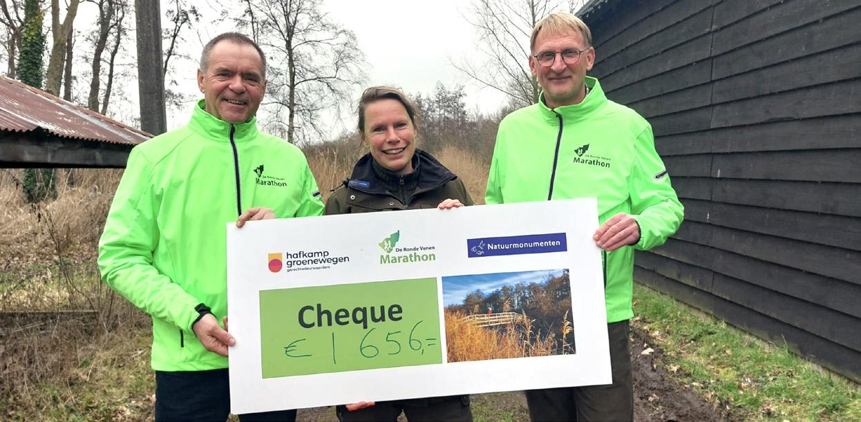 Voorzitter Pim Limburg (rechts op de foto) en secretaris Wil Voorbij (links) hebben namens de Hafkamp Groenewegen De Ronde Venen Marathon de vrijwillige bijdragen van de lopers – maar liefst 1656 euro – overhandigd aan Olga Ekelenkamp van Natuurmonumenten. De vrijwillige bijdrage aan Natuurmonumenten is inmiddels een jaarlijkse traditie bij DRV Marathon; dit keer komt het bedrag ten goede aan de instandhouding van de broedkolonie/habitat van lepelaars. Pim Limburg: “De samenwerking met Natuurmonumenten is al jaren goed. De lopers gaan over het Botsholpad in het gelijknamige natuurgebied. Mooi om op deze manier iets terug te kunnen doen.” Olga Ekelenkamp is blij met de bijdrage. “Dit jaar vindt groter onderhoud plaats aan de broedkolonie/habitat van lepelaars door extra takkenbossen te plaatsen op een legakker. Werkzaamheden die niet gebudgetteerd waren, dus het geld blijkt ontzettend welkom.” Wil Voorbij: “Deze mooie traditie houden we in stand. De inschrijving voor de 9e editie start op 11 april. Dan kan men weer een vrijwillige bijdrage doen. We zien nog ruimte om het deelnemersaantal te laten groeien en gaan er vanuit ook dit jaar een mooi bedrag te verzamelen.” www.derondevenenmarathon.nl en Facebook.