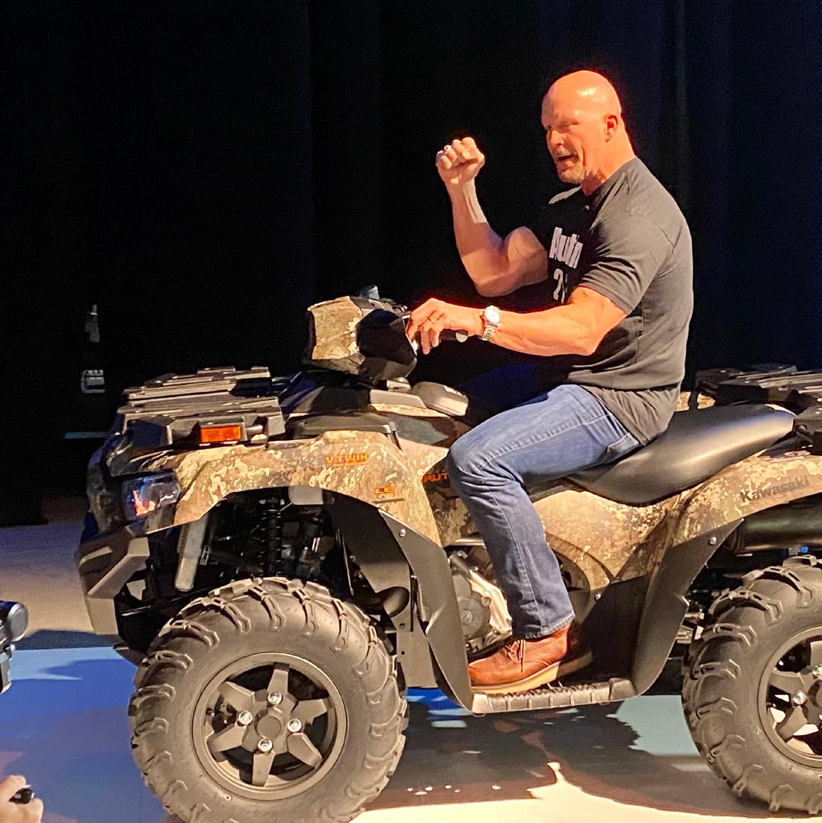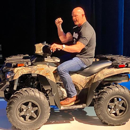 The man beneath the mullet! Brand Ambassador Stone Cold Steve Austin starred in Kawasaki’s Super Bowl commercial, disrupted the stage presentation to lead dealers onto the show floor, did several live streams and then signed autographs until the lights went on.