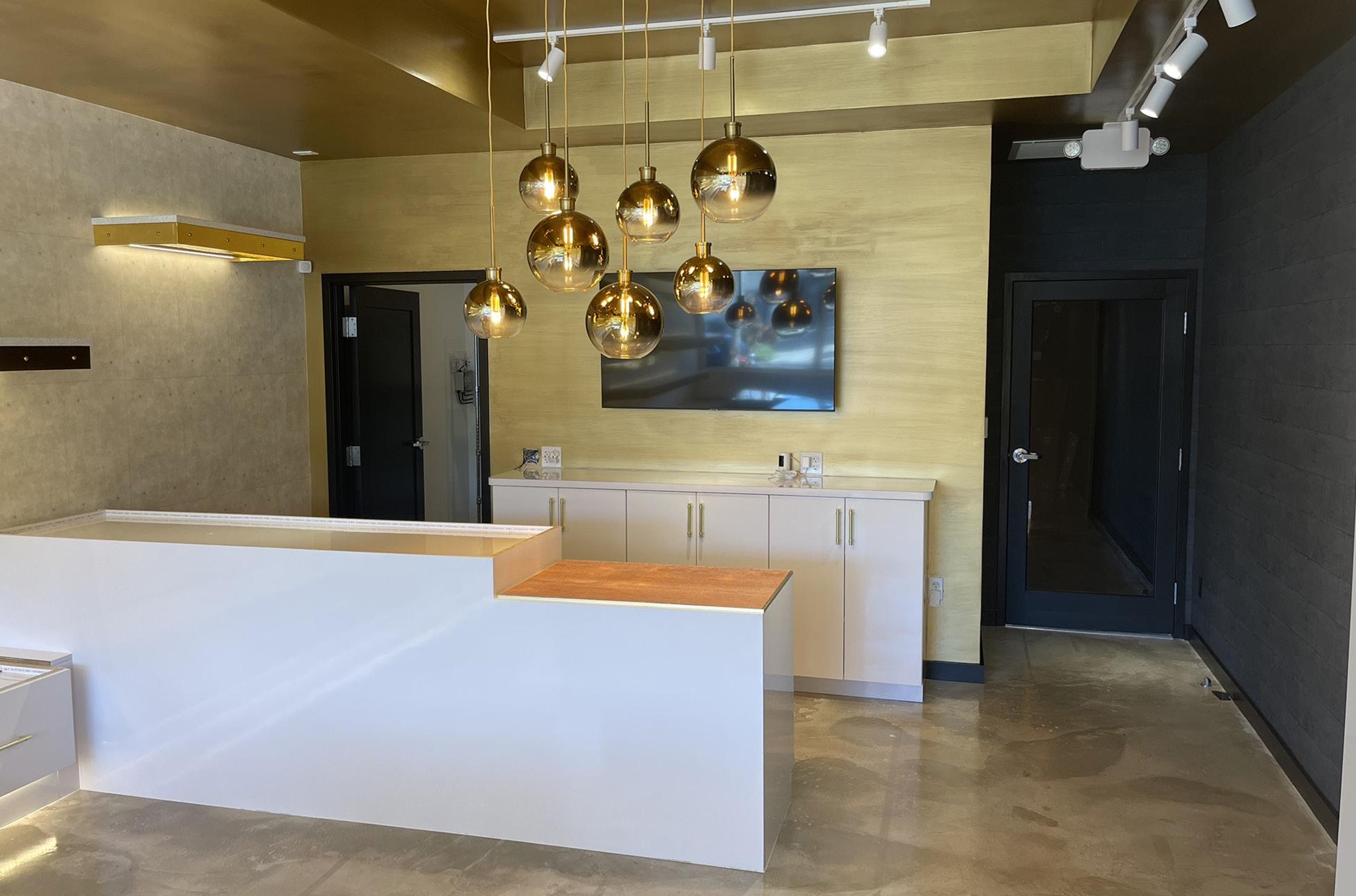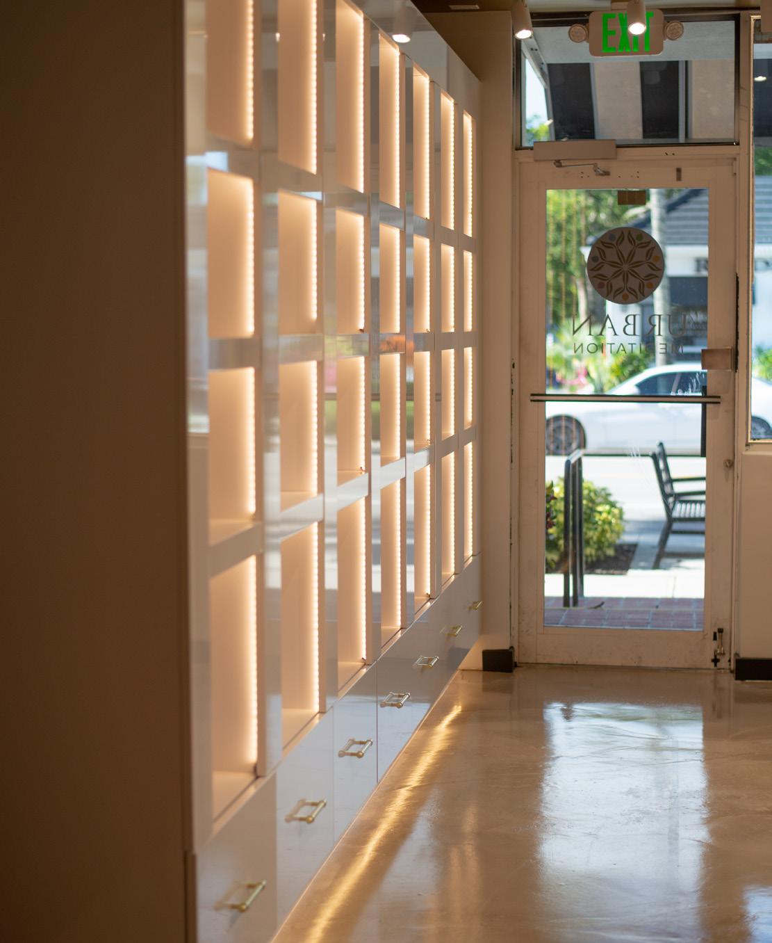 Urban Meditation is a luxury retailer selling products prompting relaxation and meditation. Their new 1,035 sq. ft. storefront in Downtown Naples focuses on ultra-modern finishes with white cabinetry, contrasting dark walls, and interior lighting fixtures placed inside countertops. Their relaxation ideology is highlighted by the project’s two large sauna rooms with hot rock tables for relaxing meditation sessions.