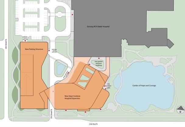 Naples Comprehensive Health is expanding the NCH Baker Hospital Downtown Campus to include a new Heart, Vascular, and Stroke Institute (HVSI), along with a new parking structure to support both the existing hospital and the planned addition. The HVSI will be a five-story expansion directly connected to the current six-story hospital, adding approximately 186,000 square feet of space. A new four-level parking structure will also be constructed, featuring a pedestrian bridge that spans 7th Street North and connects directly to the HVSI expansion.