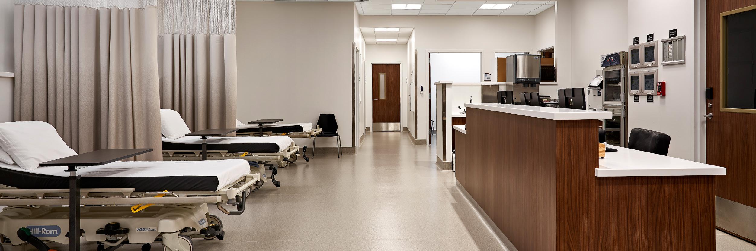 The renovation project was complex and involved a variety of tasks. The existing Emergency Department’s main walk-in entry was relocated, and the entire department underwent an extensive renovation to provide all-new exam rooms and resuscitation rooms. The existing nurse stations and support spaces were also upgraded, along with the waiting room.