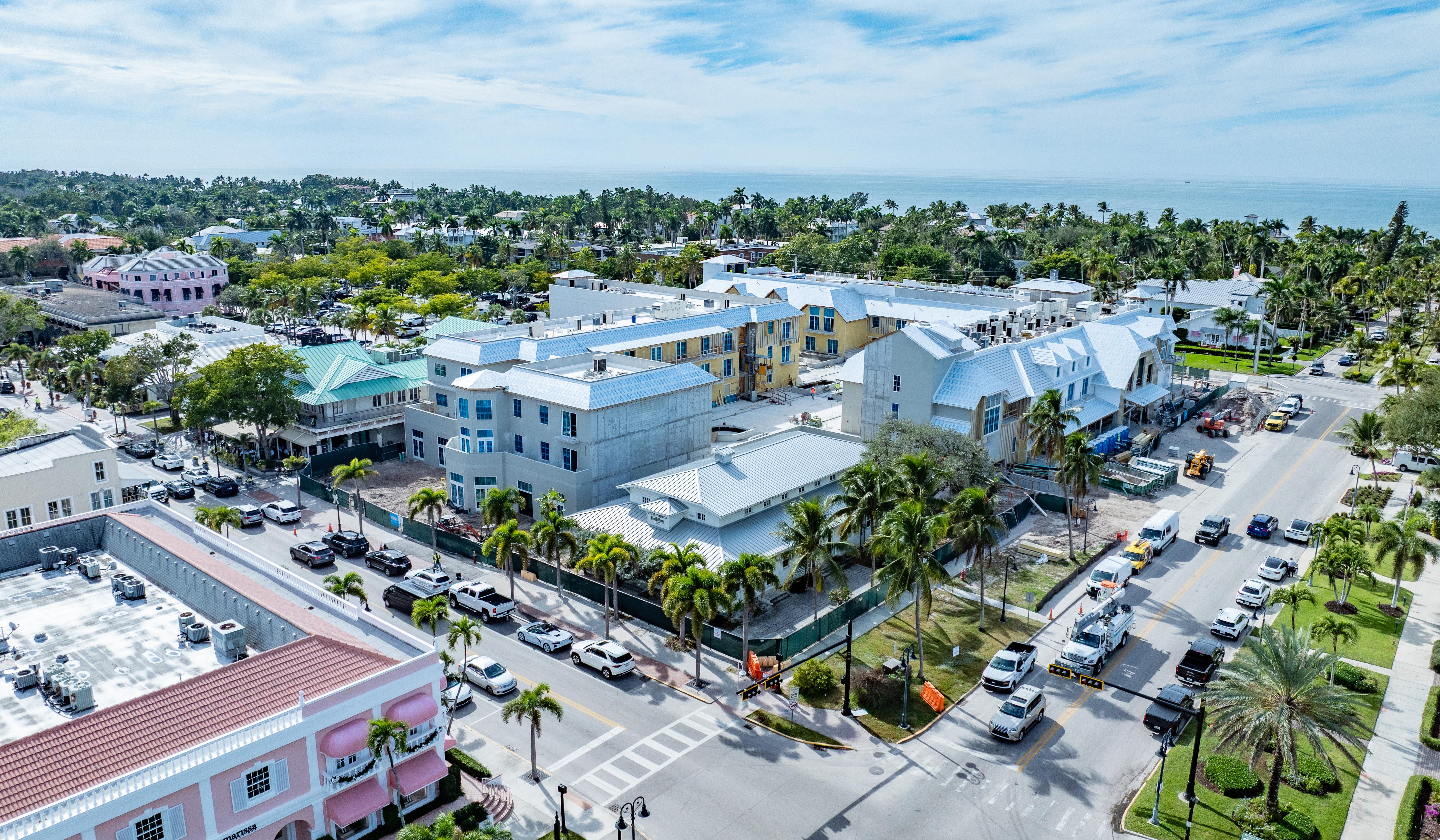 The Old Naples Hotel is an all-new boutique hotel situated on two acres along Gordon Drive, Broad Avenue, and the historic Third Street South. It is designed to be complimentary to the historic architecture native to the district and is inspired by the iconic Naples Hotel which opened in 1889 and served guests for nearly 90 years. The new resort features luxury, vintage finishes and numerous amenities that cater to both hotel guests and the general public. Among these amenities include a cafe and bar with outdoor patio seating along the historic street side, a picturesque courtyard with lush landscaping, a hotel sundry shop for any small item needs, a luxury spa, and retail commercial space along Third Street South.